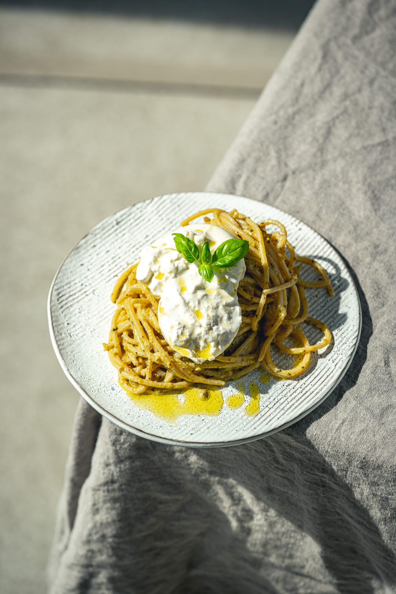 Abgerundet mit herrlich cremiger Burrata und würzigem Parmesan ergibt Pistazien-Pesto eine wahrhaft köstliche Mahlzeit, die sich problemlos vorbereiten und bei Bedarf in wenigen Minuten auf den Tisch zaubern lässt. Einfach Pasta nach Wahl zubereiten und genießen! Dazu ein Glas trockener Weißwein wie Sauvignon Blanc oder Pinot Grigio und ich bin im Himmel! Amore.
