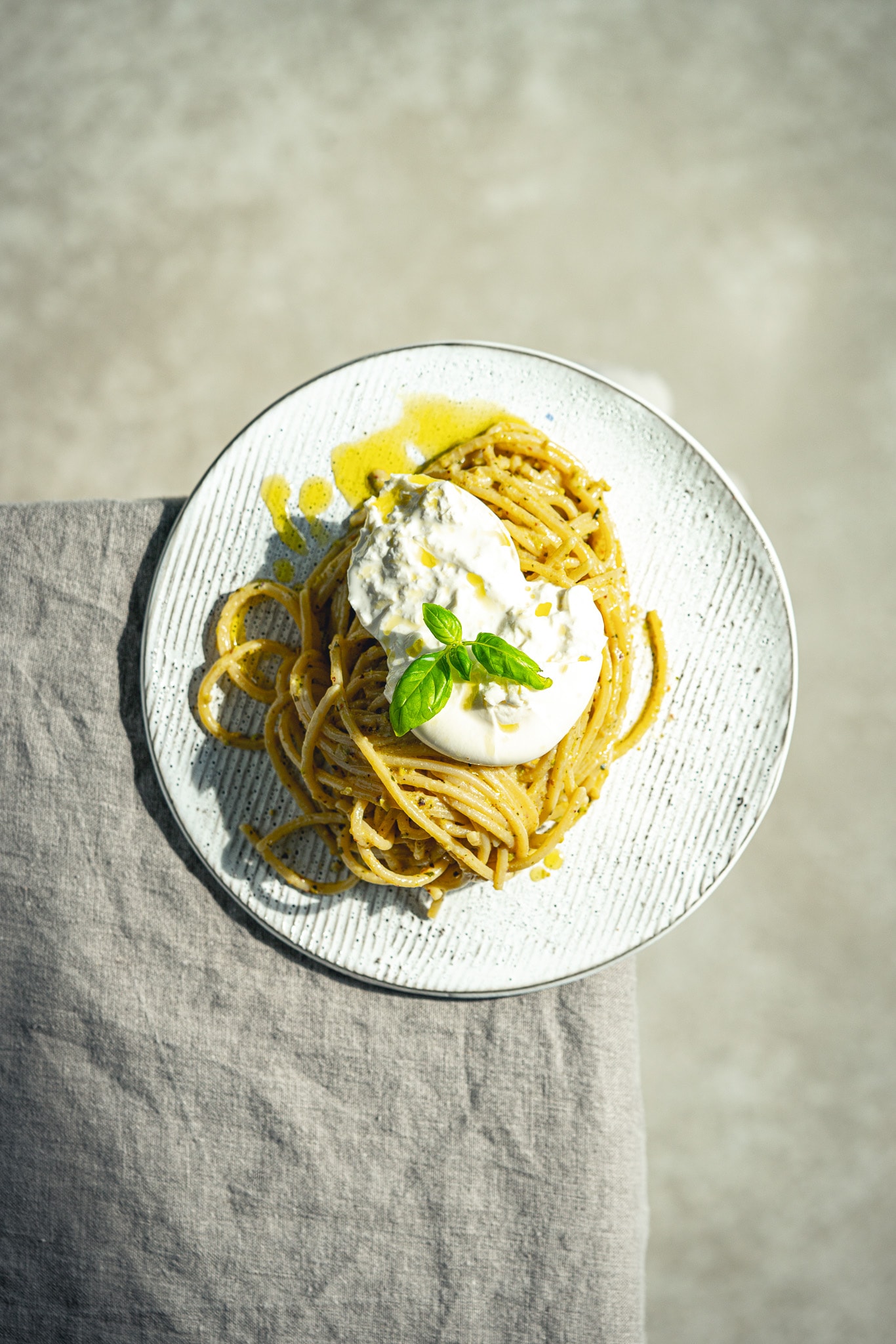 Pasta anrichten, mit Basilikum garnieren und am Ende mit Burrata toppen.