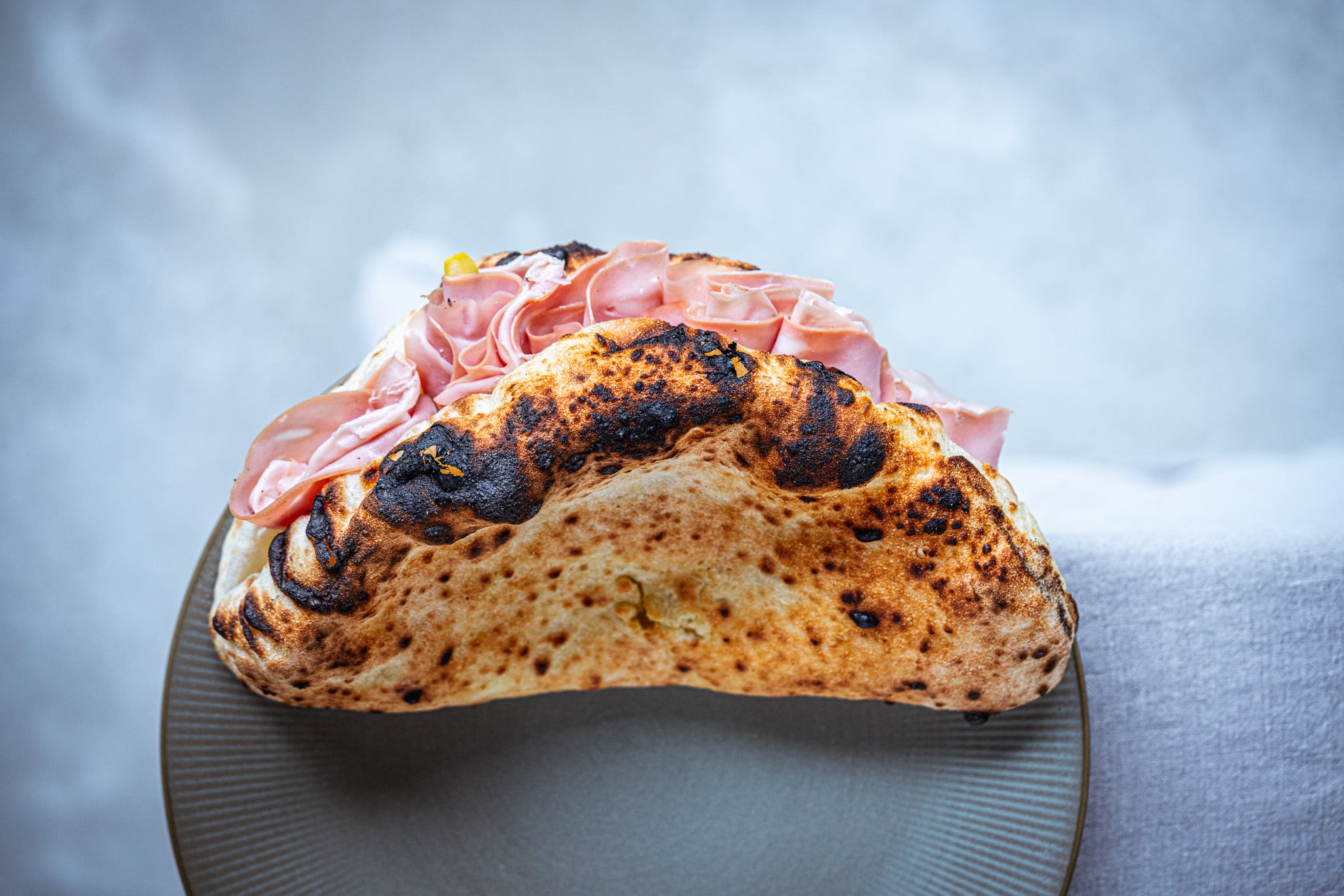 Die Mortadella-Scheiben dreimal falten und so zu kleinen Röschen zu formen, mit der die Pizza nun gefüllt wird.
