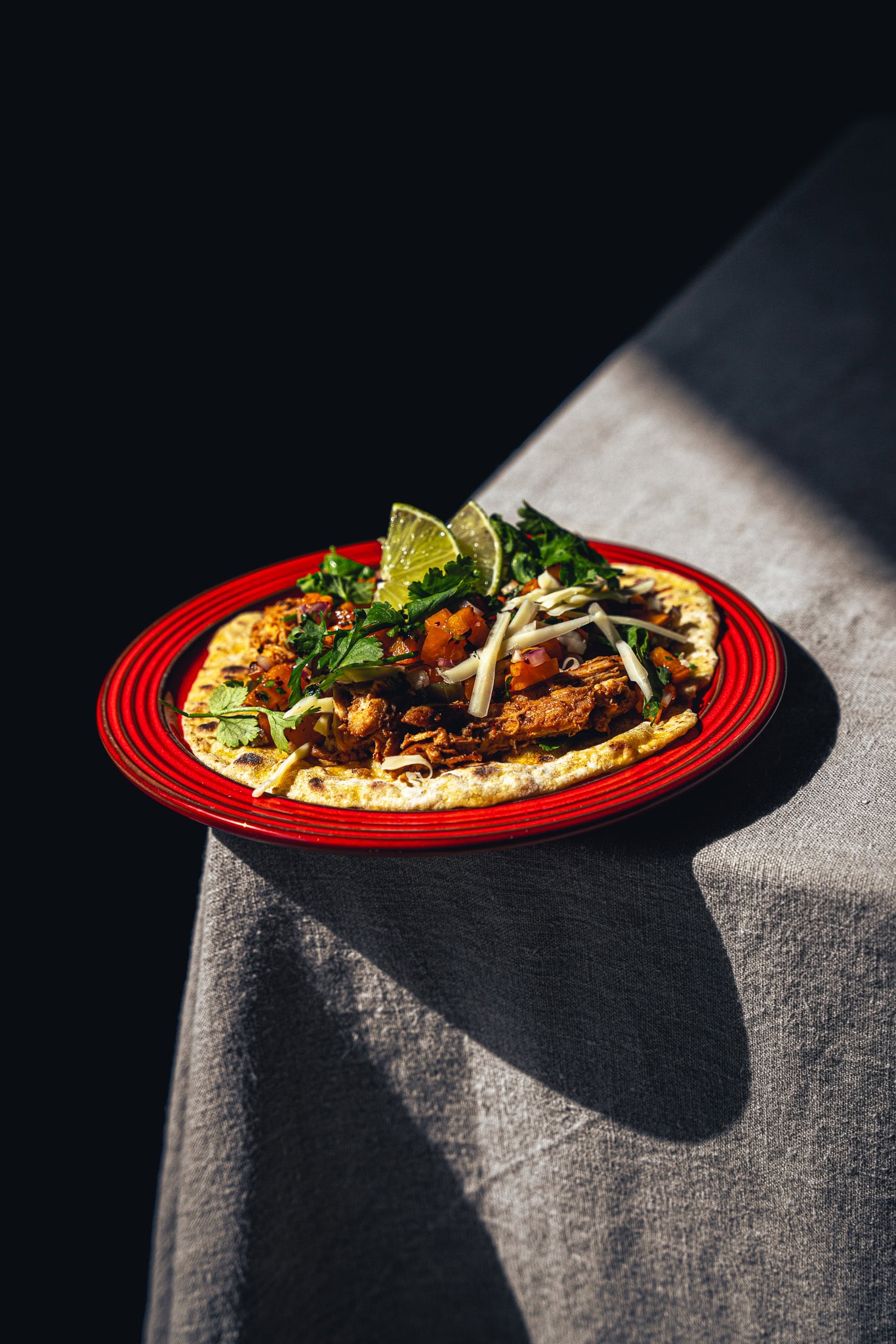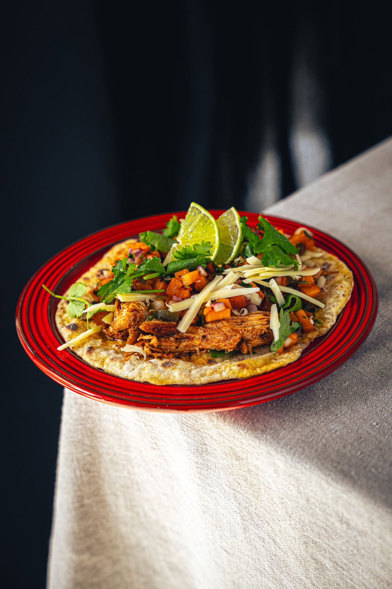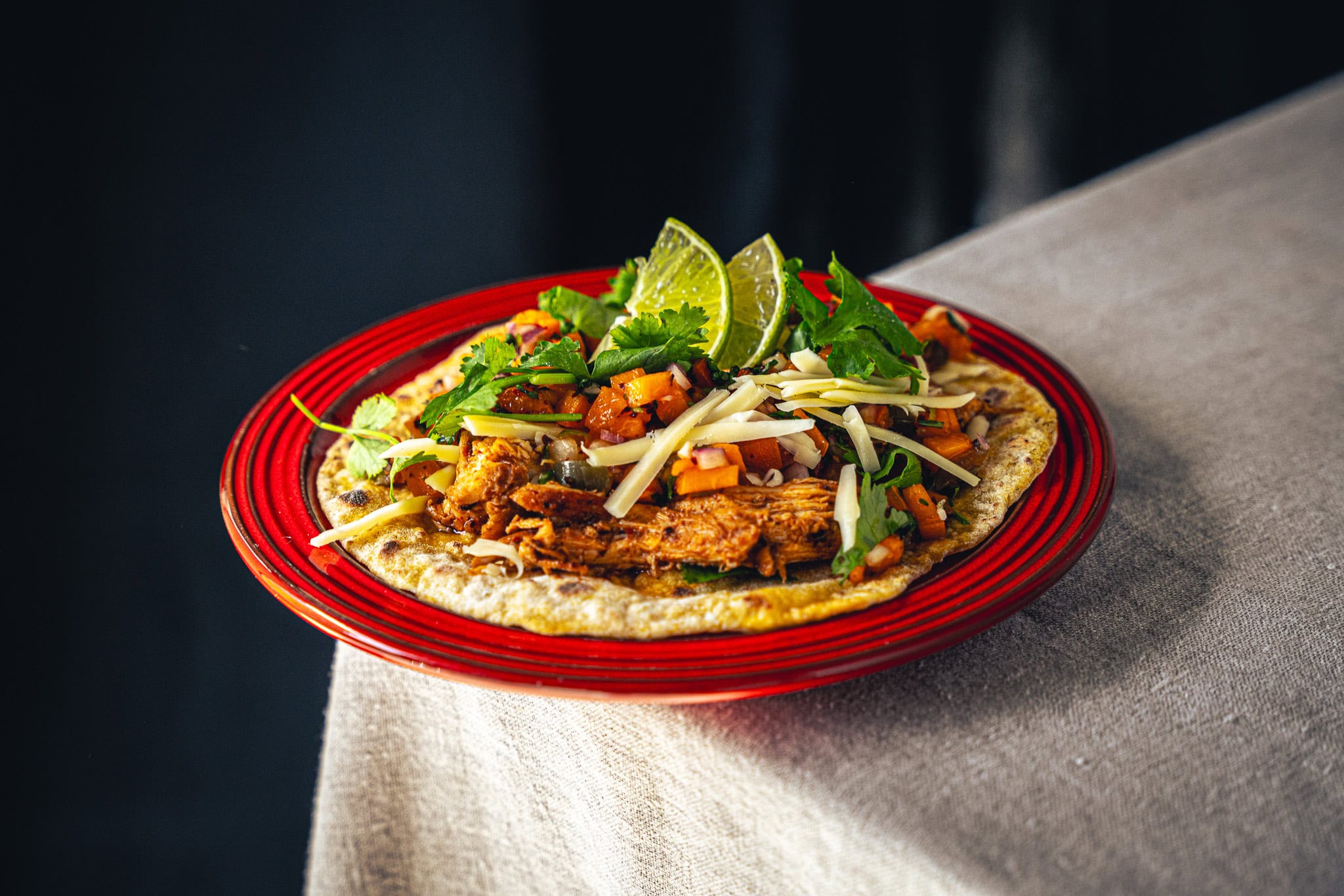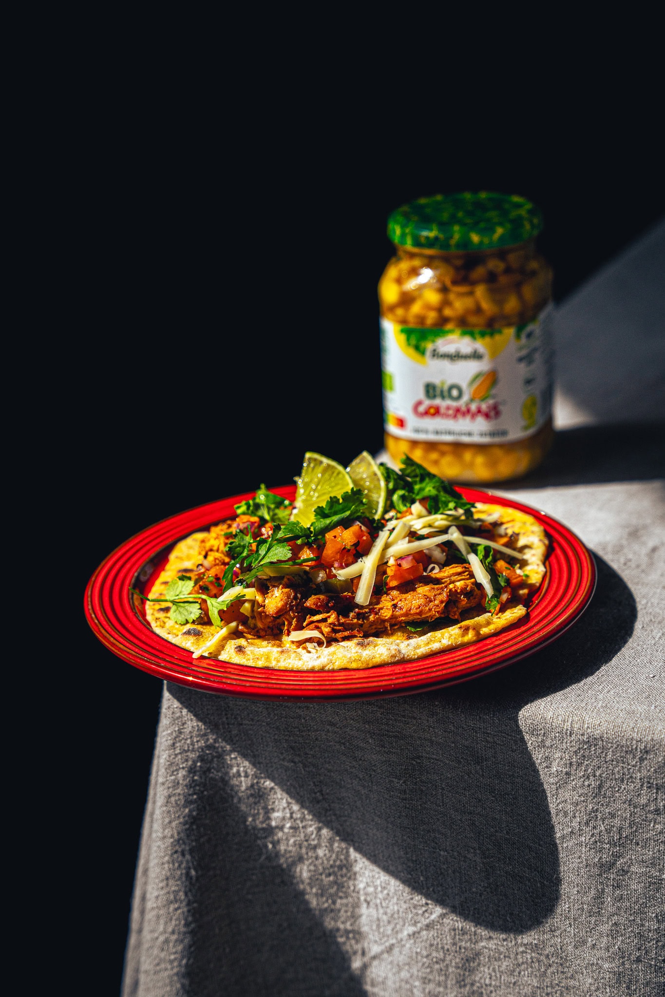 Jetzt bauen wir unsere Tacos: Zuerst kommt das Fleisch, dann Cheddar, Salsa und Koriander zum Garnieren. Fertig sind unsere Pulled Chicken Mais Tacos!
