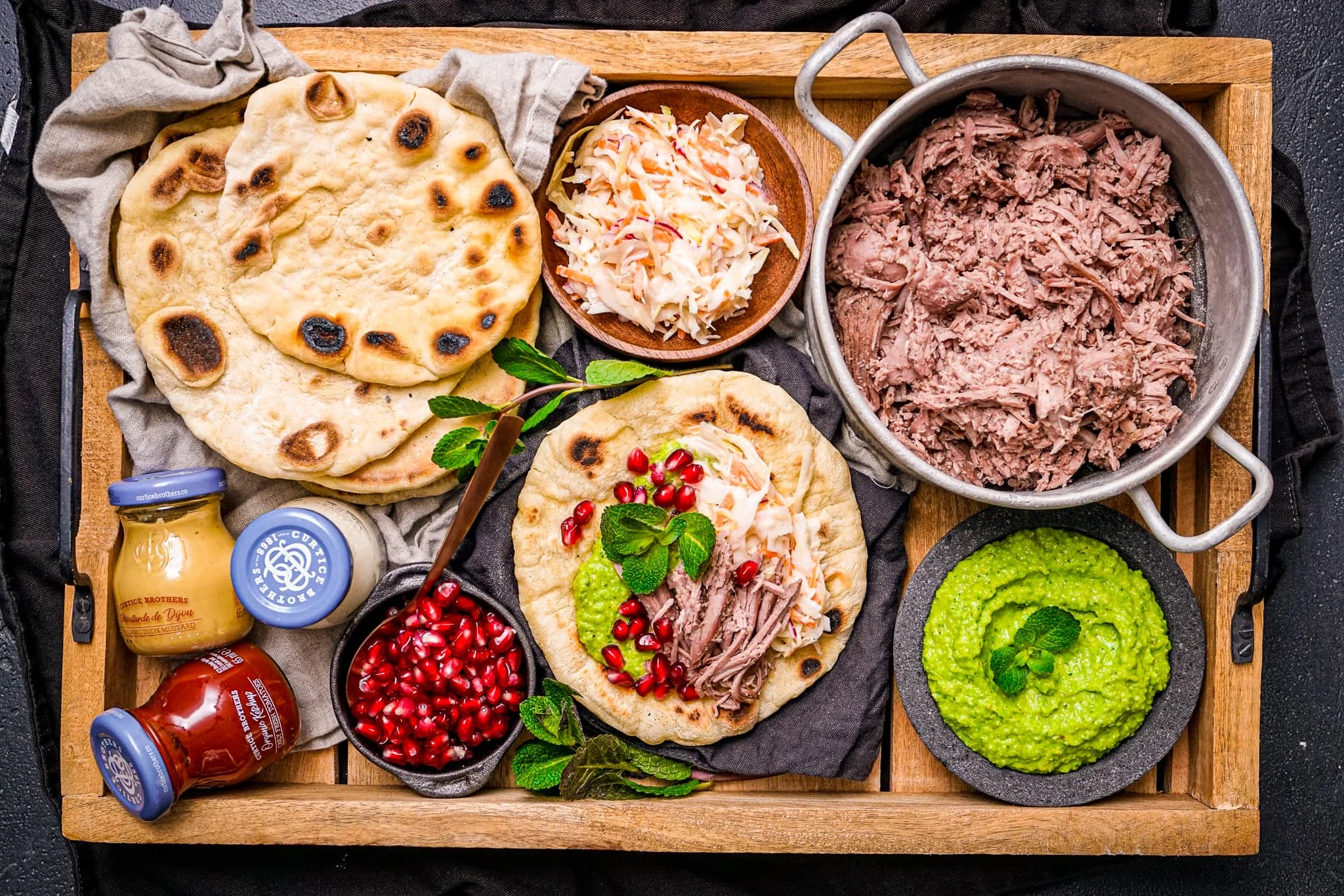 Pulled Lamb ist eine wirklich willkommene Abwechslung zu Pulled Pork & Co. und erfreut sich nicht umsonst einer immensen Beliebtheit. Dazu serviere ich am liebsten Erbsen-Hummus, Coleslaw und natürlich selbst gebackenes, frisches Fladenbrot.