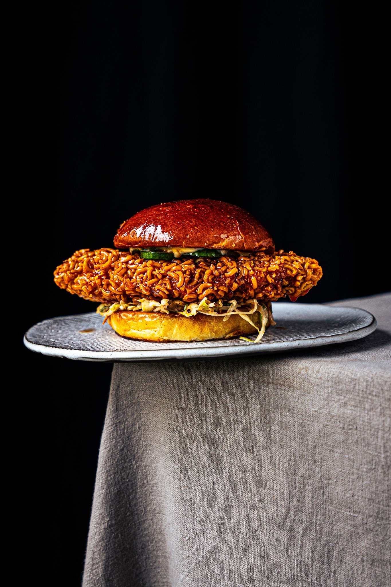 Ramen Burger bzw. Sandwiches sind in New York gerade sprichwörtlich in aller Munde. Ich habe mir deshalb spontan eine eigene Variante überlegt: Knuspriges Hendl in Ramen-Panier mit spicy Glaze, Coleslaw und scharfen Pickles. Natürlich im fluffigen Brioche-Bun. What else? Finger-licking good! So hast du deine Instantnudeln noch nie gegessen: Knuspriges Hendl und würzige Ramen vereinen sich zu einem Burger – nein, DEM ultimativen Burger! Mein Ramen Fried Chicken Burger bringt sowohl Crunch als auch saftige Schärfe auf den Teller und ist sicher nichts für schwache Gaumen. Mehr ist hier absolut mehr!