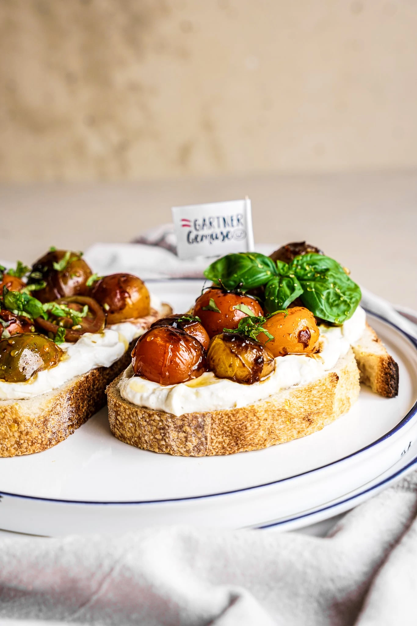 Außerdem haben meine Ricotta Crostini einfach alles, was man braucht: Knusprig getoastetes Brot, cremiger Ricotta, karamellisierte Paradeiser und frische Kräuter – eine absolute Geschmacksexplosion. Perfekt als Frühstück, Snack oder bei abendlichen Netflixen. Aber auch für deine nächste Party eignen sich die crunchy Crostinis ganz wunderbar. Unbedingt ausprobieren, du wirst begeistert sein – genau wie deine Gäste!