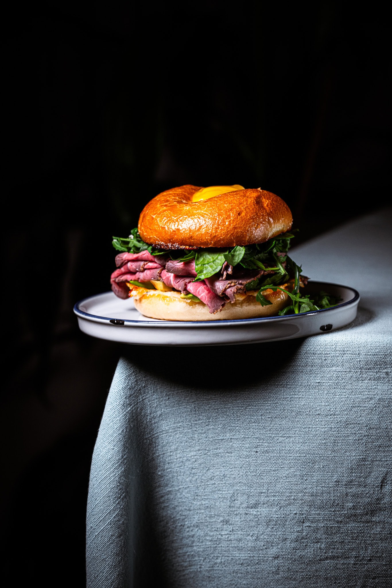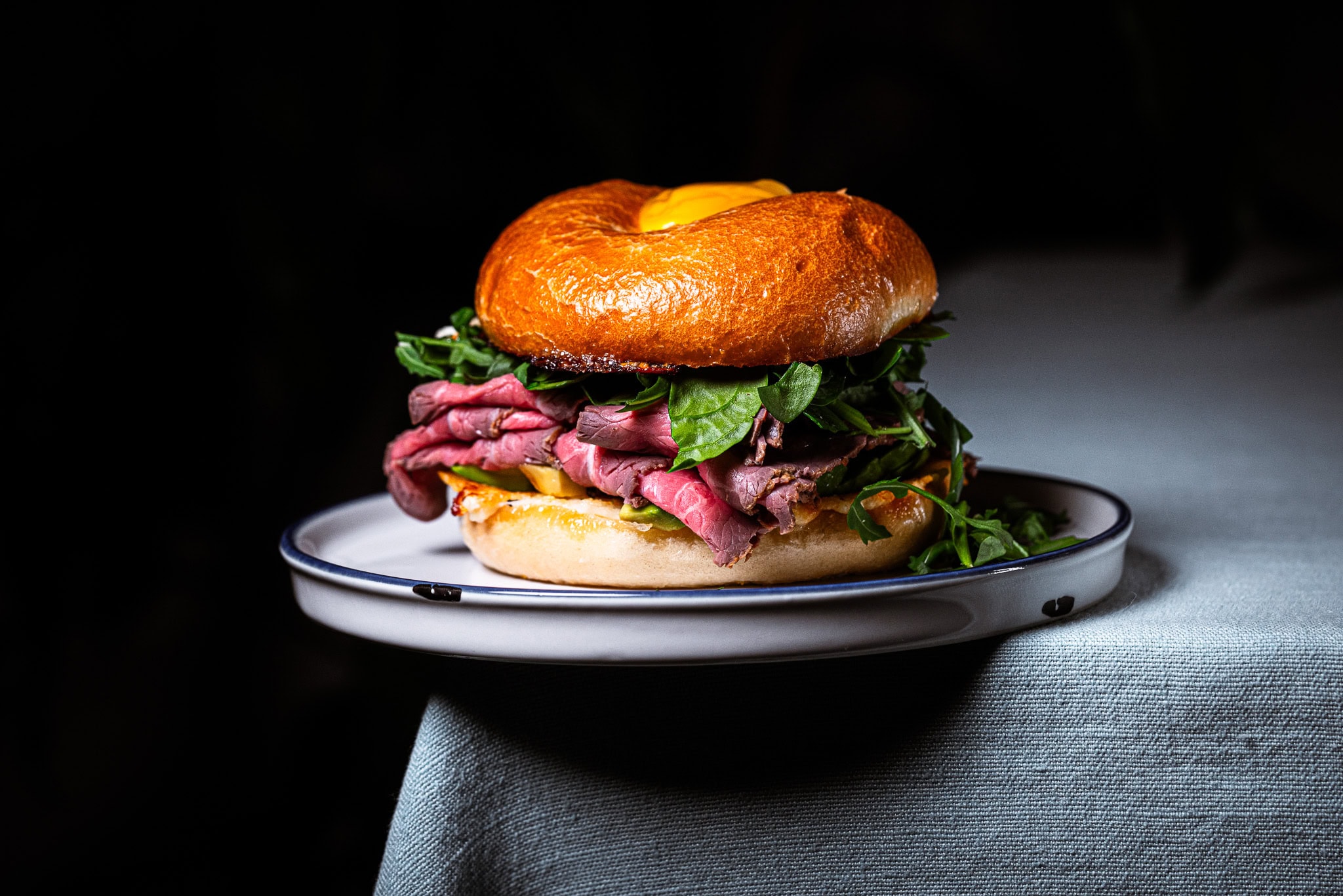 Danach kommen Babyspinat, Rucola und deine Roastbeef-Scheiben auf den Bagel.