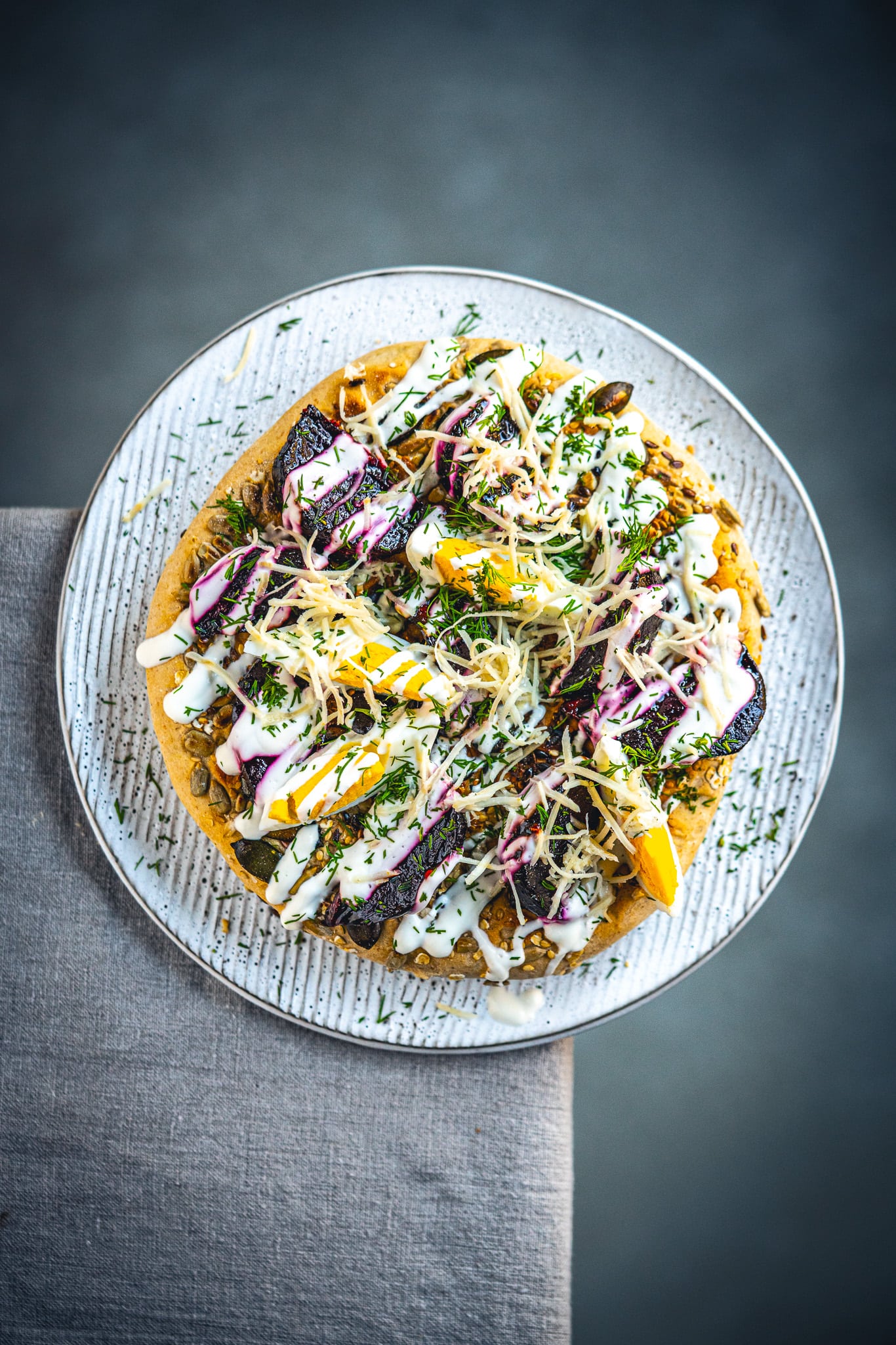 Die Rote Rübe wird dabei mit einer Mischung aus Olivenöl, Weißweinessig und Honig im Ofen gegart und dabei gleichzeitig geröstet und glasiert. Währenddessen kannst du das rustikale Fladenbrot vorbereiten, das mit einer gschmackigen Mischung aus Kernen und Samen ummantelt wird. Getoppt wird das Ganze mit hart gekochten Eiern, griechischem Joghurt, frischem Dill und viel Kren. Klingt gut? Ist es auch!