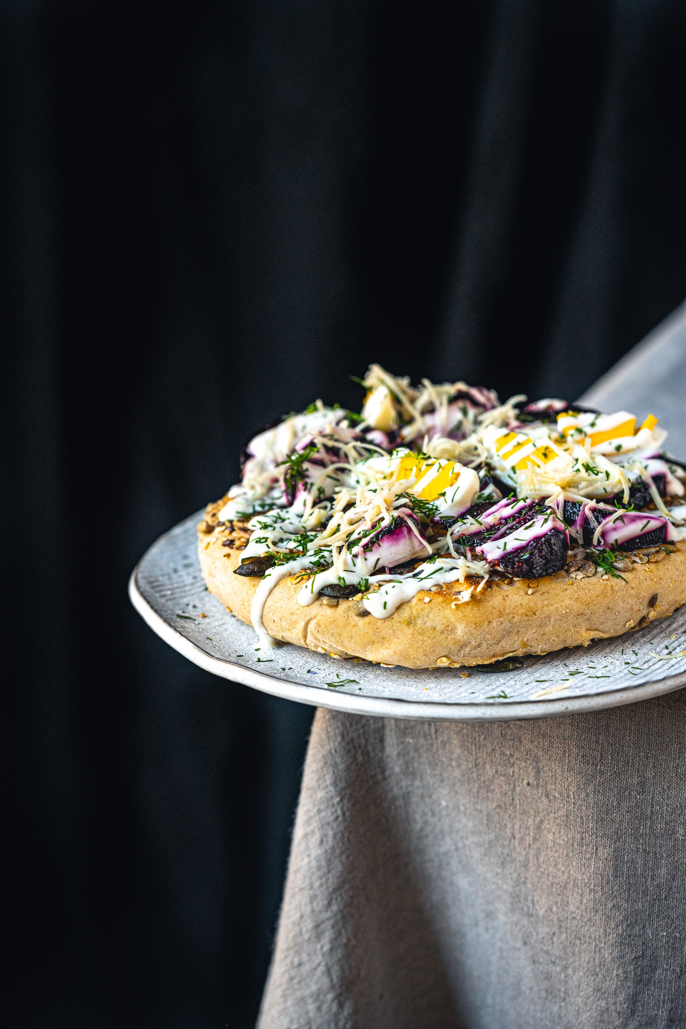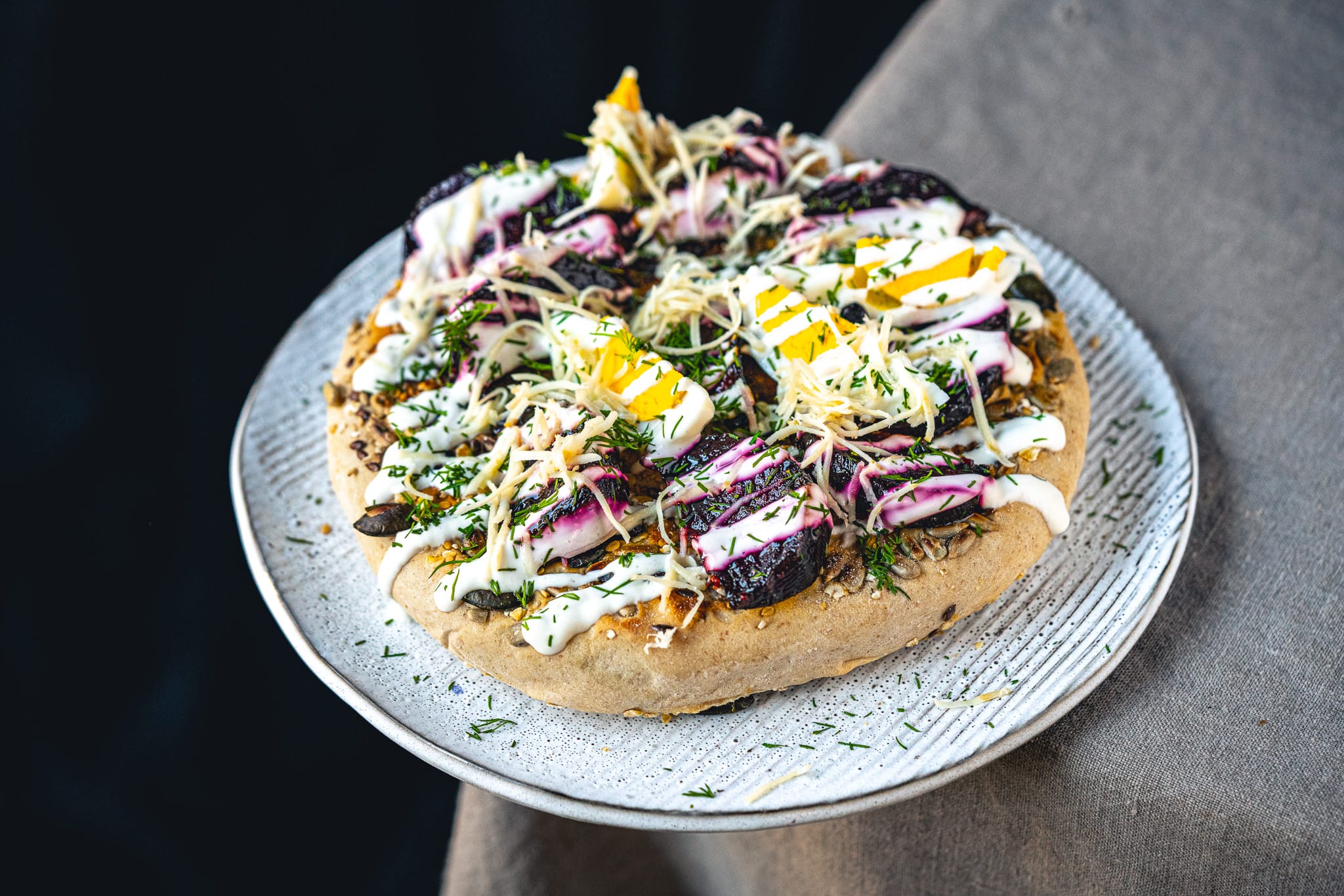 Verteile nun die roten Rüben auf den Fladen. Dazu kommen geachtelte, harte Eier, Joghurt, Dill und Kren.