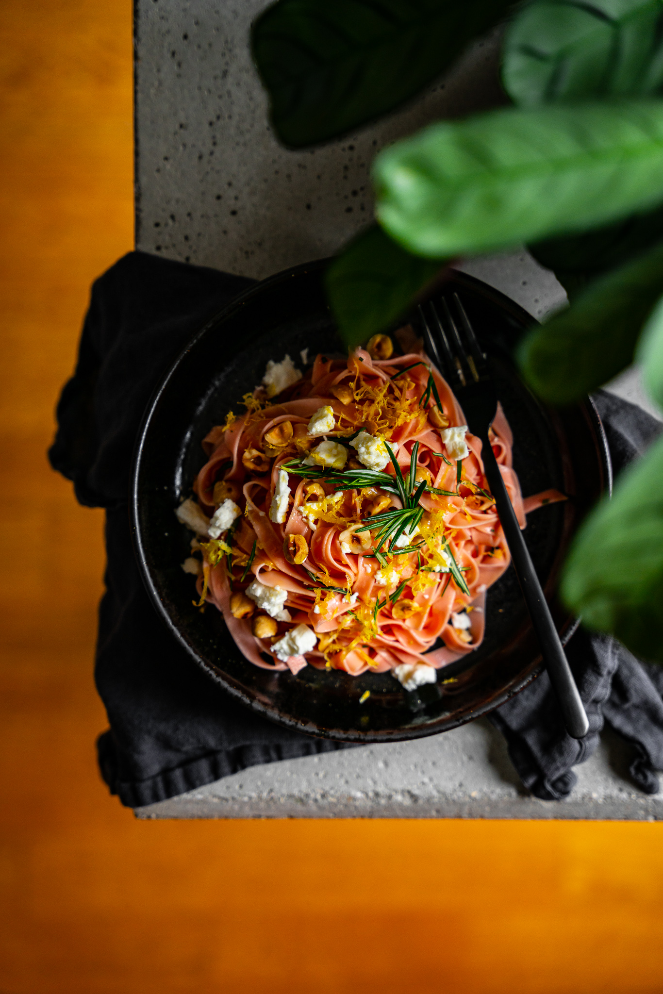 Rote Rüben-Rezepte mit Nudeln in der Zutatenliste gibt es ja im Netz zugegebenermaßen einige. Dieses Gericht sieht jedoch ein Einarbeiten der Rüben direkt in den Nudelteig vor. Das ergibt eine geschmacklich runde Pasta, die sich hervorragend mit jeder Menge Kräutern, Nüssen und Käse ergänzen lässt.