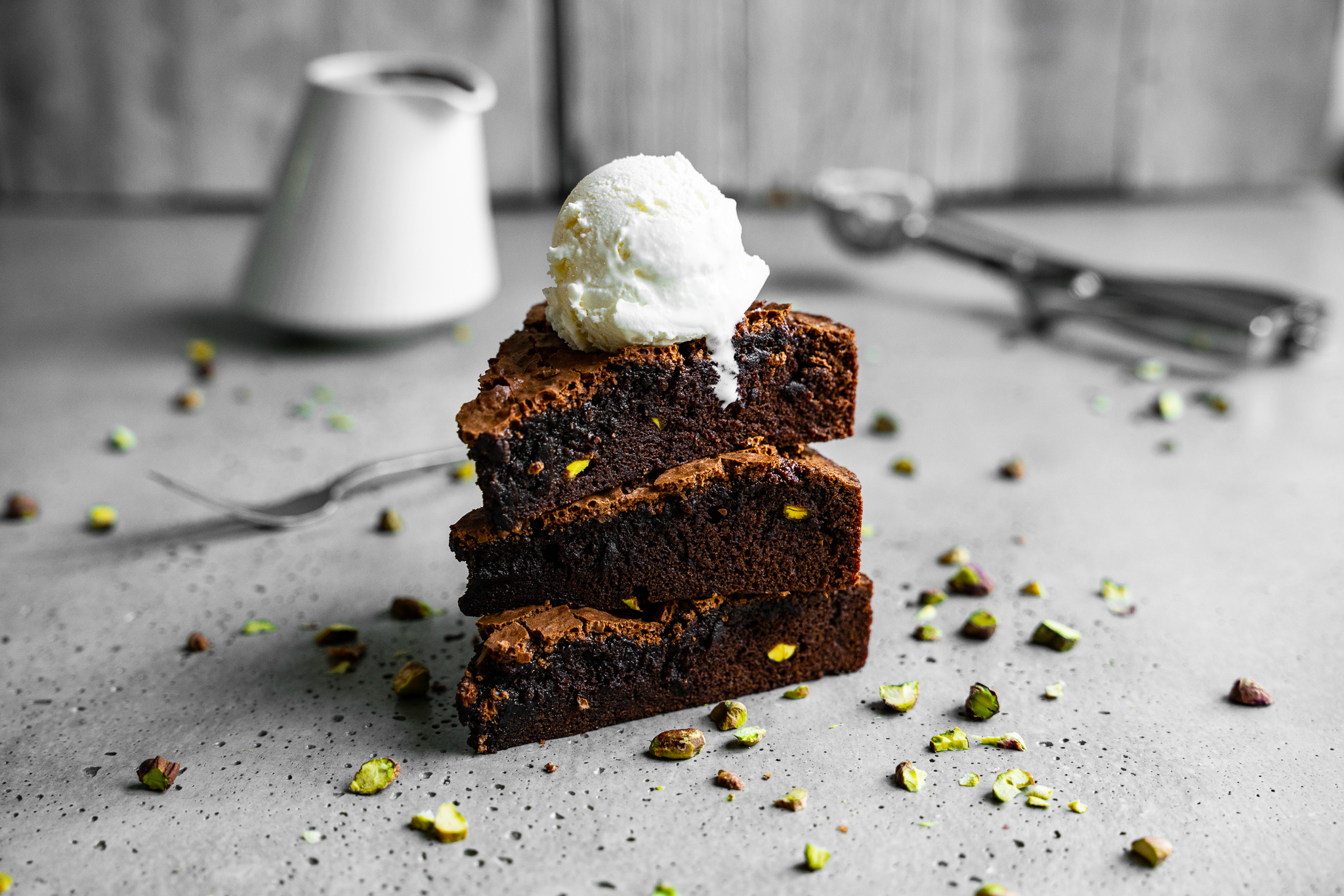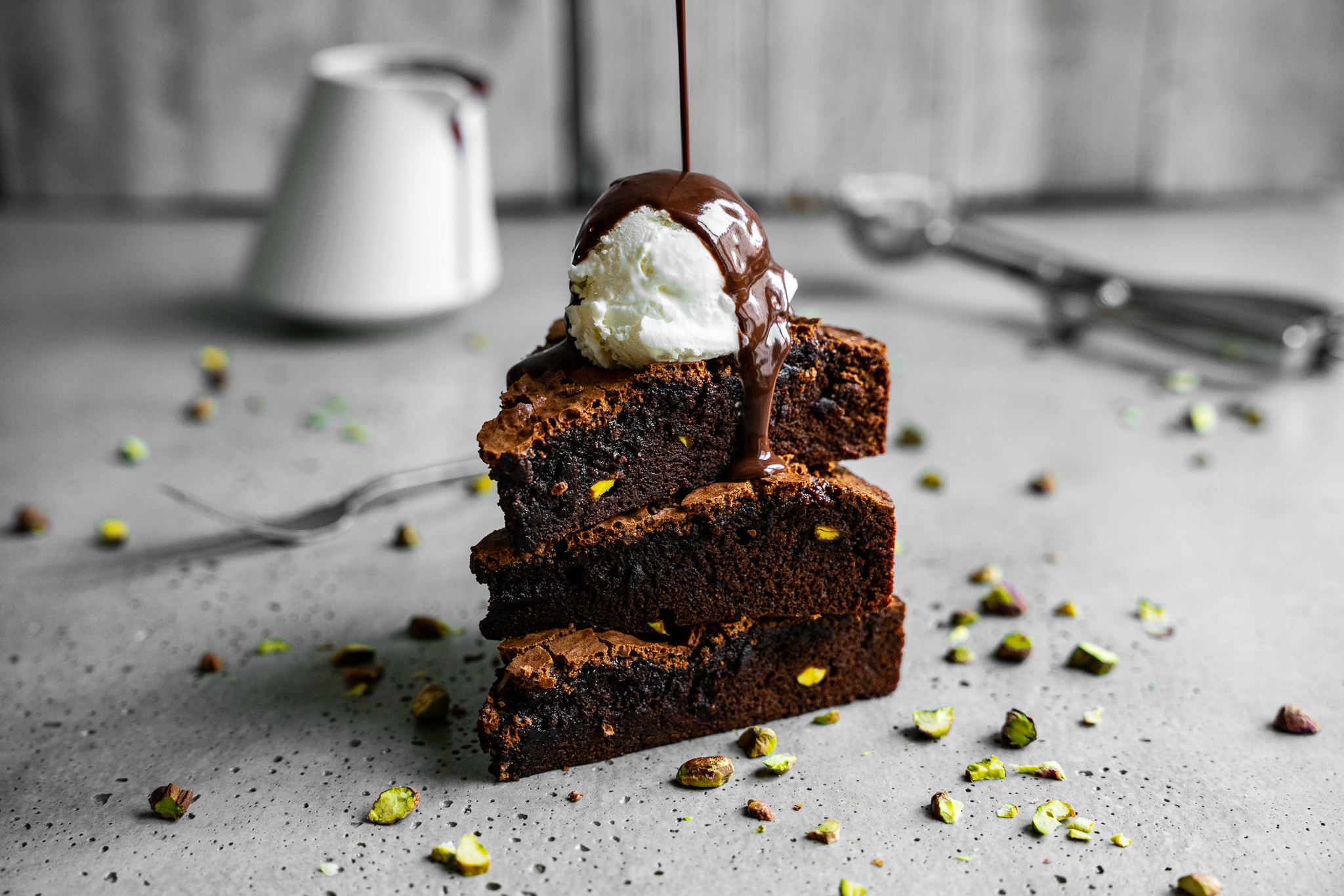 Saftiger Schokokuchen ist einfach genau dein Ding? Zartschmelzend, fudgy und schokoladig hoch drei darf’s sein? Dann wirst du dieses Teil hier einfach lieben! Dunkle Schokolade, Schokodrops und ein doppelter Espresso machen nämlich einen ziemlich guten Job. Abgerundet wird dieses wunderbare Dessert mit einem Hauch Vanille und fein gehackten Pistazienkernen.