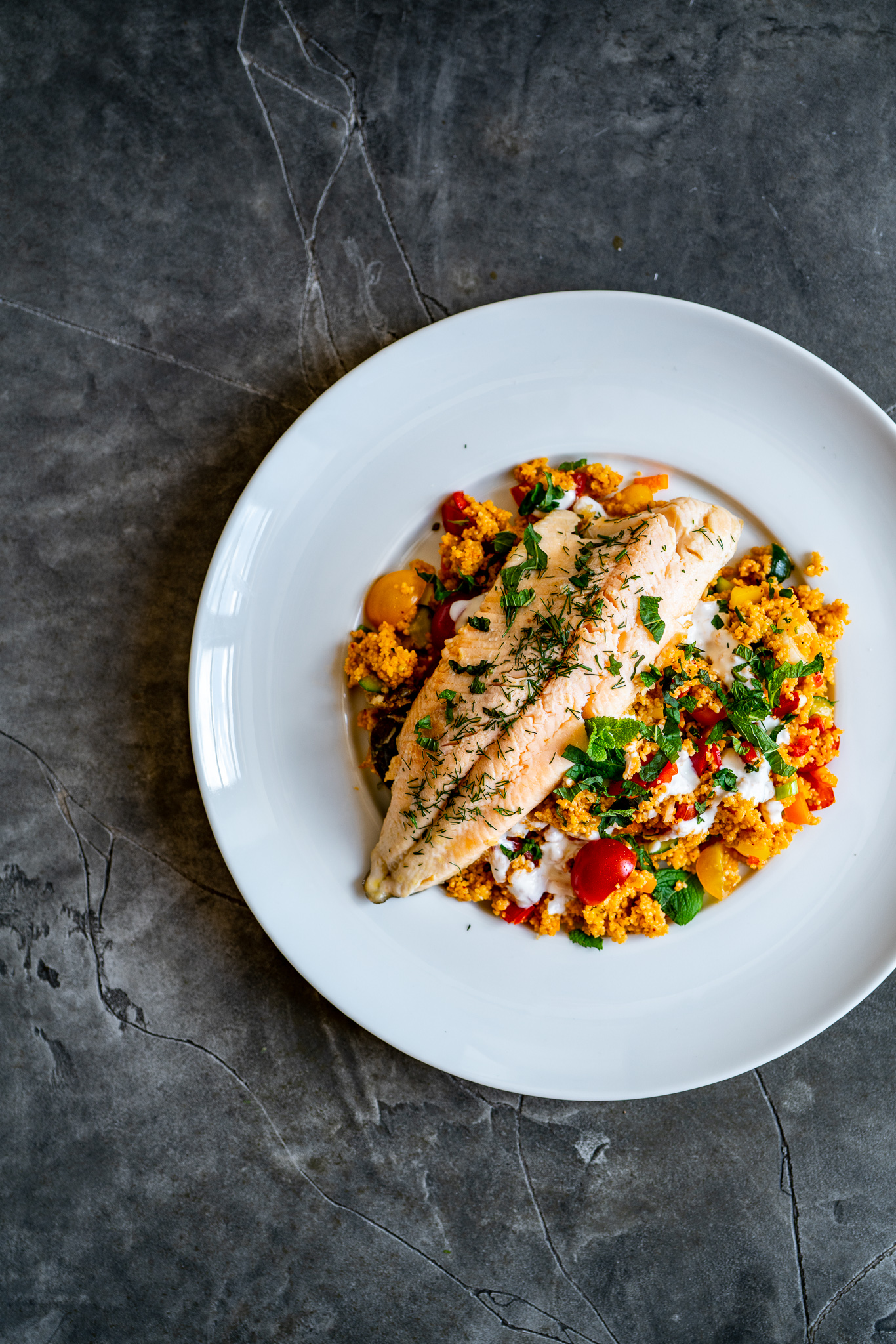 Gerichte auf Couscous-Basis erfreuen sich im Alltag nicht zuletzt aufgrund ihrer oft raschen Zubereitung einer großen Beliebtheit. So auch bei mir! Wer Lust auf eine völlig neue Interpretation hat, dabei aber auf Gemüse aus der Region nicht verzichten möchte, wird dieses Rezept lieben! Der marinierte Couscous passt hervorragend zum bunten Gemüse und dem knusprig gebratenen Saibling. Sommerlicher wird’s nicht!