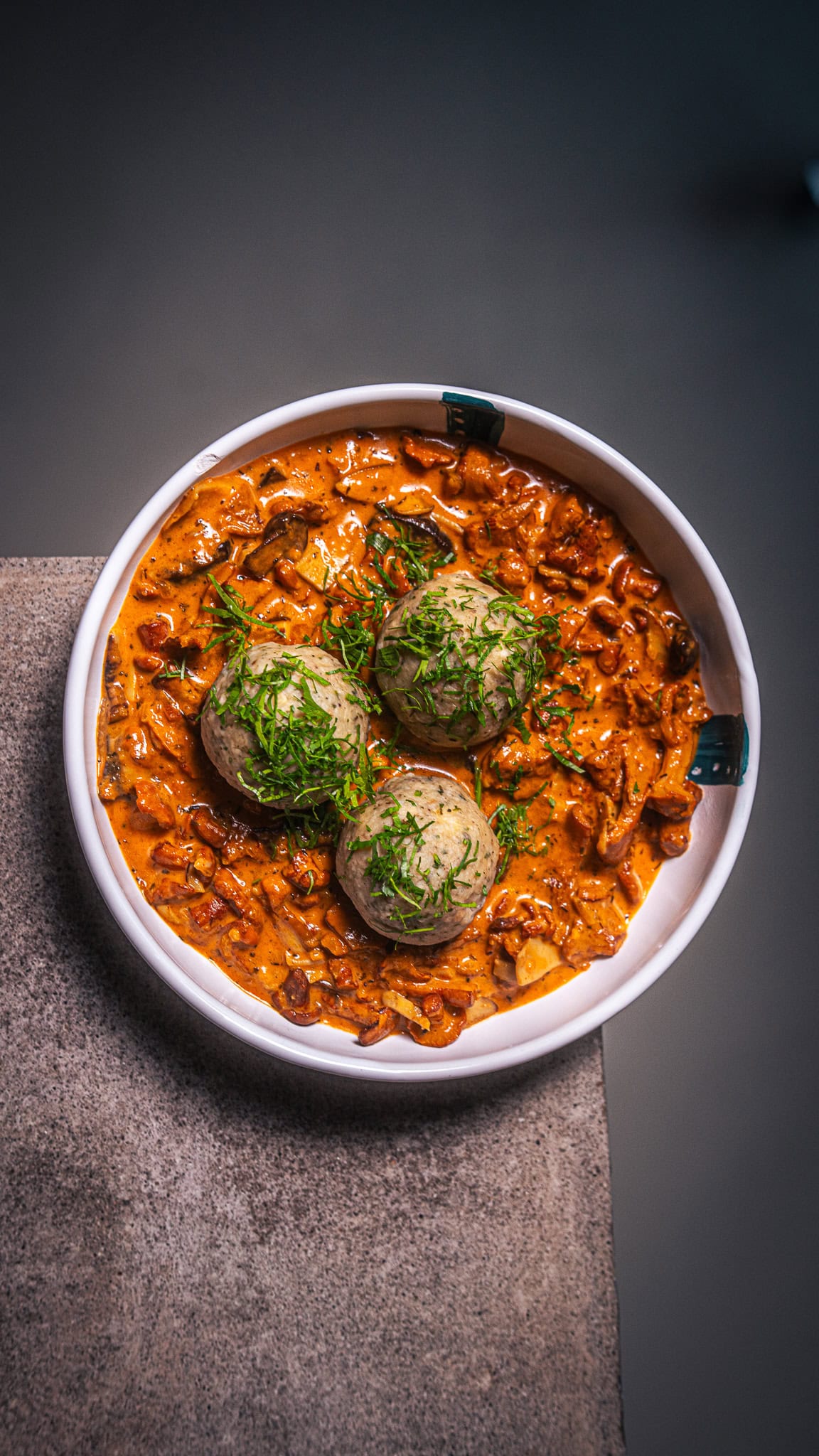 Cremiges Schwammerlgulasch mit Semmelknödeln ist ein vegetarisches Gericht aus Pilzen, Sauerrahm und Waldaromen, das nicht nur Vegetarier zu schätzen wissen. Manchmal darf’s ruhig ein bisschen außergewöhnlich sein: Meine spezielle Version eines Gulaschs dreht sich deshalb nicht um Fleisch, sondern um kräftige Schwammerl. Geröstet für den Biss, gemeinsam mit einer cremigen Sauce aus Sauerrahm, Schlagobers und Gewürzen. Mein Schwammerlgulasch schmeckt nach Herbst, Wald und Würze – perfekt mit Butterspätzle, Knödel oder einfach nur knusprigem Brot.