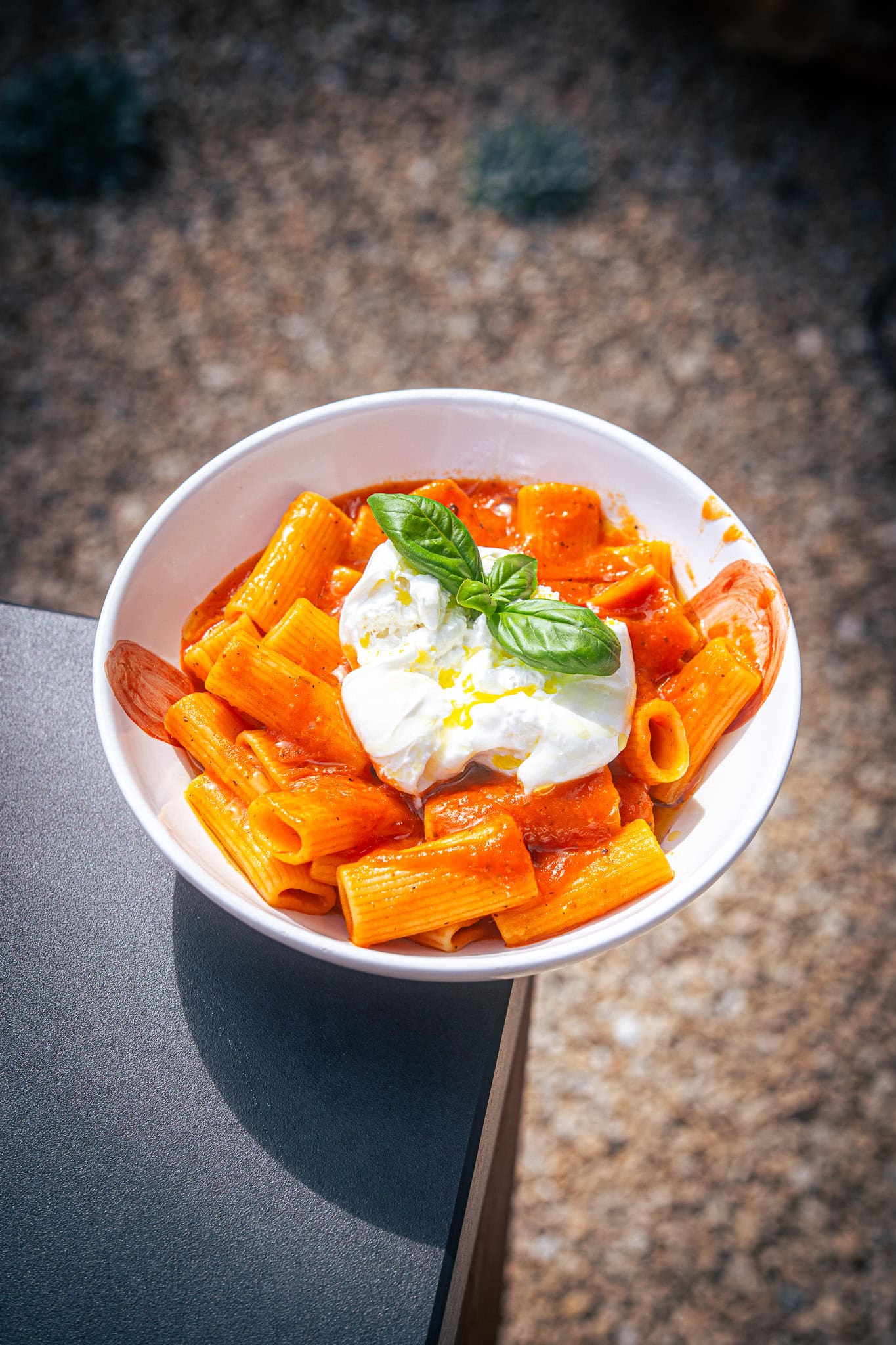 Pasta Pomodoro mit gegrillten Tomaten auf Teller geben, Burrata obendrauf, frisches Basilikum dazu und mit etwas Balsamico beträufeln.