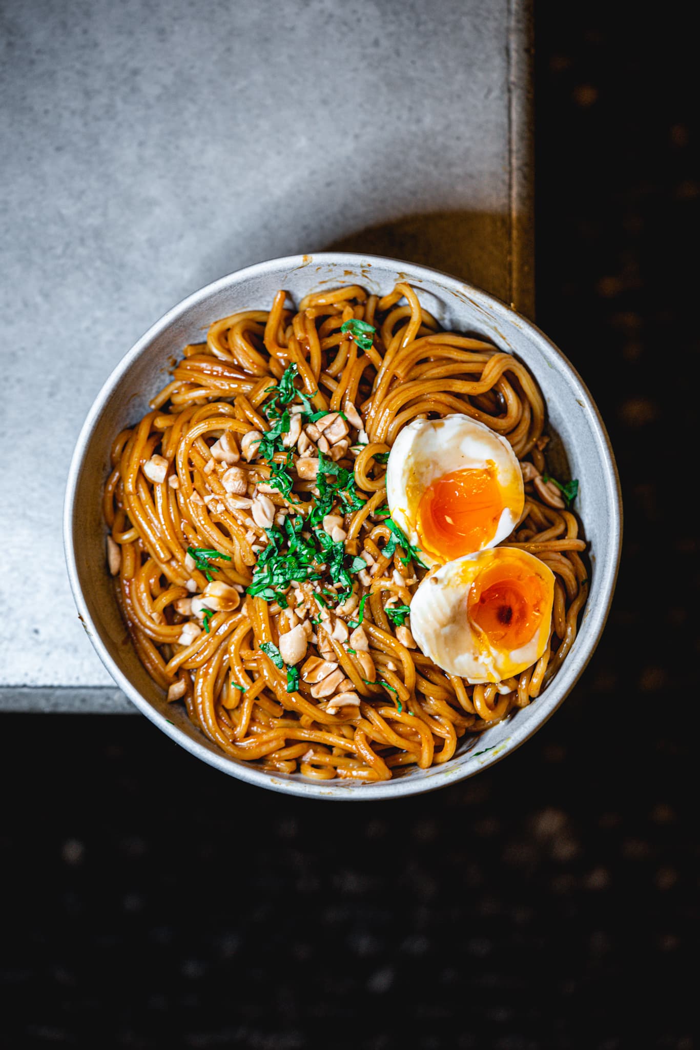 Mit halbiertem weichen Ei und frischem Koriander und Minze garnieren – fertig sind die Spicy Peanut Noodles!