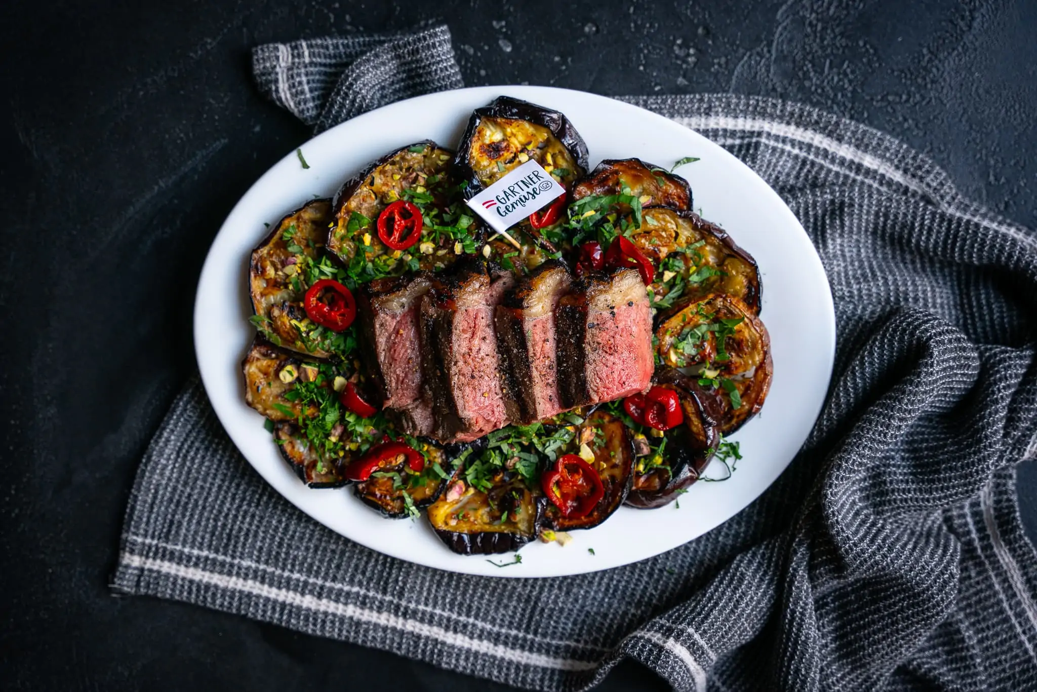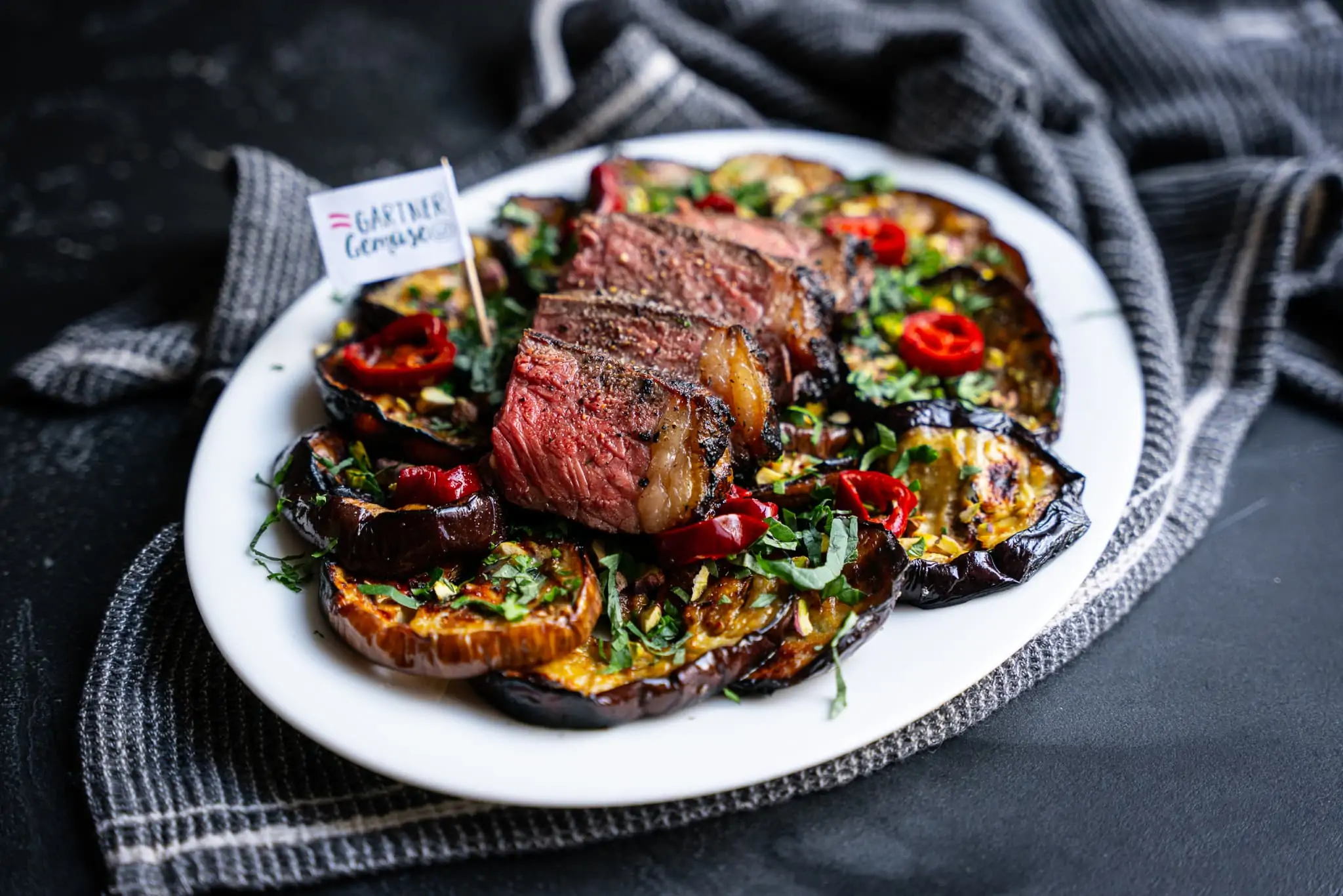 Steak und Melanzani-Salat sind eine wahrliche Traumkombi – vor allem, wenn’s mal wieder etwas schneller gehen muss! Besonders, wenn sie Melanzani schön gegrillt daherkommen – inklusive jeder Menge Röstaromen. Dazu ein fruchtiges Dressing, frische Kräuter, Pistazien für etwas Extra-Crunch sowie natürlich herrlich gereiftes, gegrilltes Steak. Absolut umwerfend! Vegetarier ersetzen das Steak am besten einfach durch gerösteten Feta. Diesen einfach in einer feuerfesten Schale mit auf den Grill stellen!