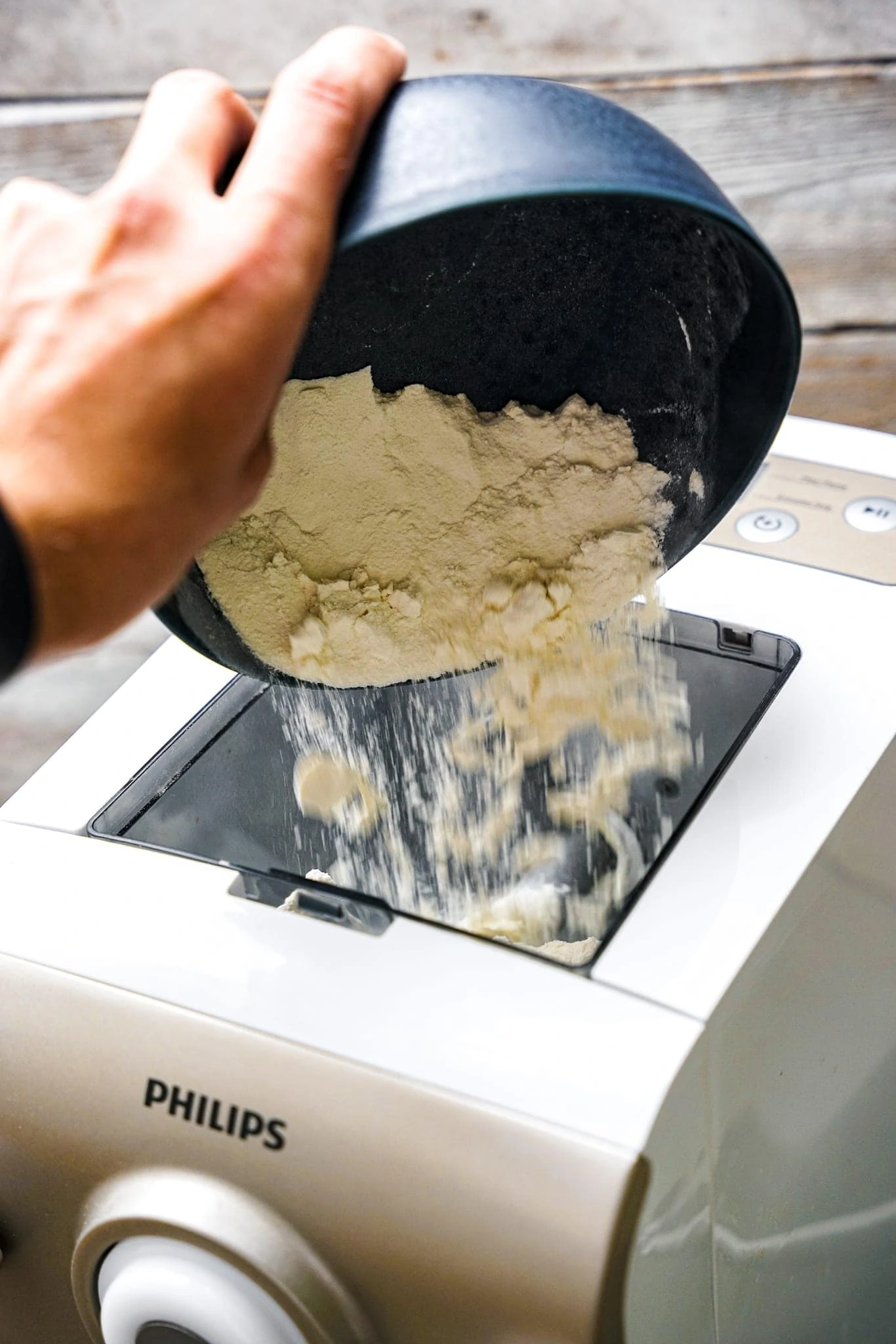 Dann den Pastamaker einschalten und auf Ei-Pasta stellen. Danach Semolina, notfalls geht auch Weizenmehl (Universal), hineingeben.