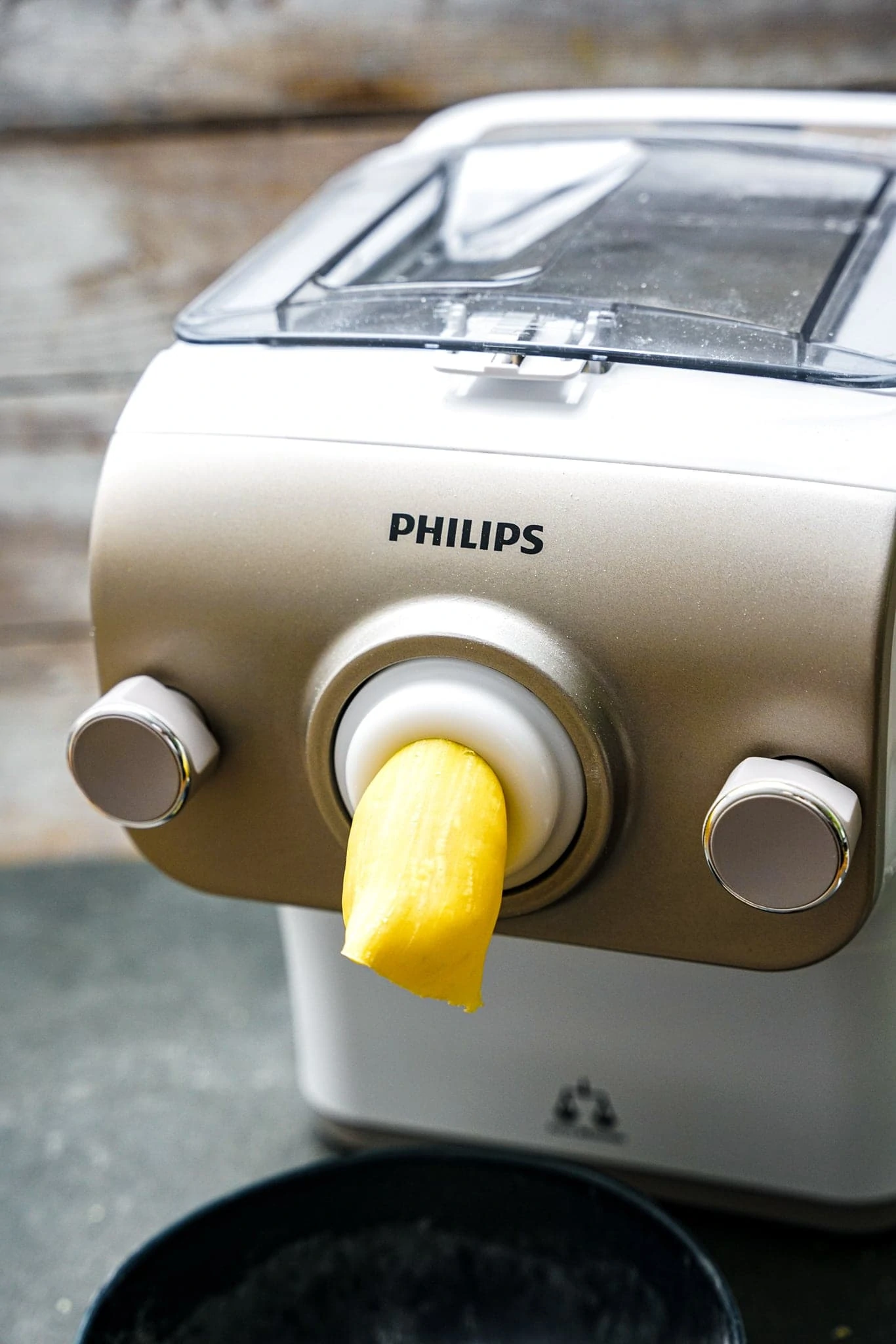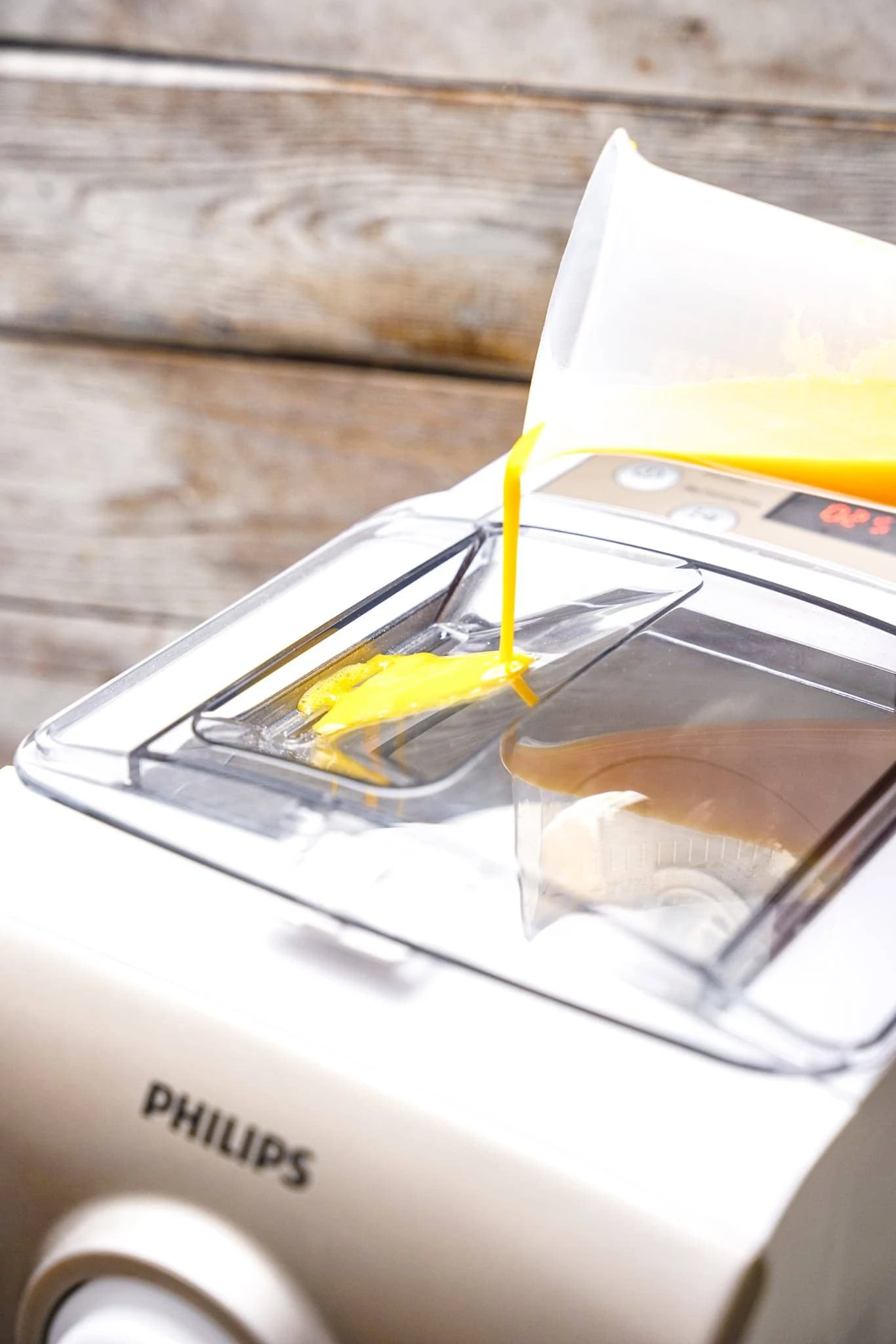 Pastamaker danach schließen, starten und je nach Angabe auf dem Display die Flüssigkeit zugeben. Diese besteht aus 5 Dottern und Wasser.