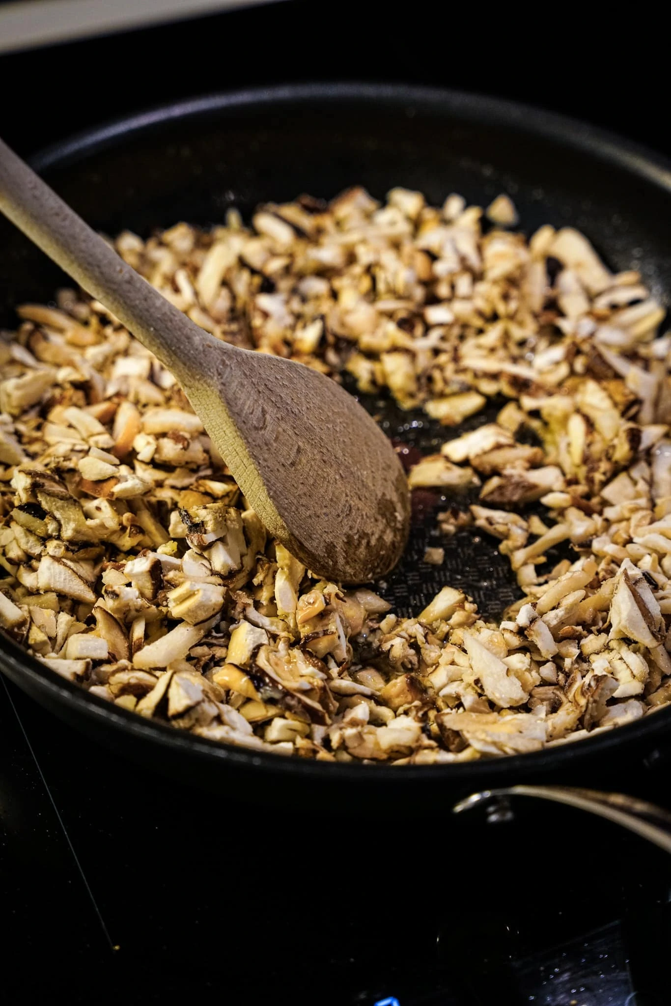 Regelmäßig umrühren und langsam weiterbraten, bis fast die ganze Flüssigkeit verdunstet ist. Das dauert dann in etwa 7-8 Minuten.