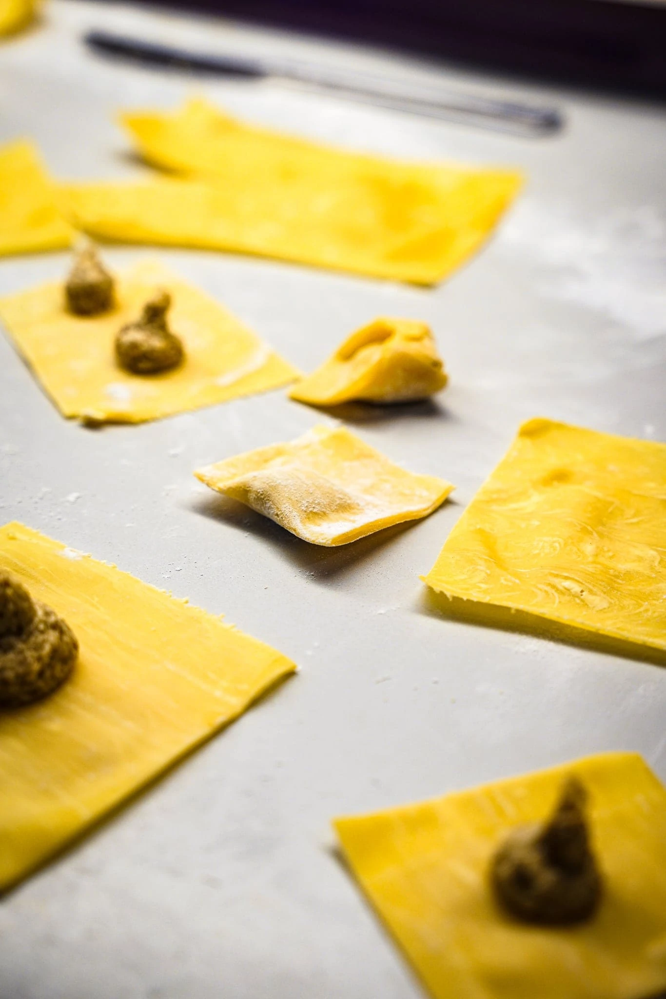 Pasta-Ränder dann mit Wasser bestreichen – einfach den Finger in Wasser tauchen und draufstreichen. Danach zu einem Viereck falten. Auf eine bemehlte Oberfläche legen und weitermachen, bis der Teig verbraucht ist.