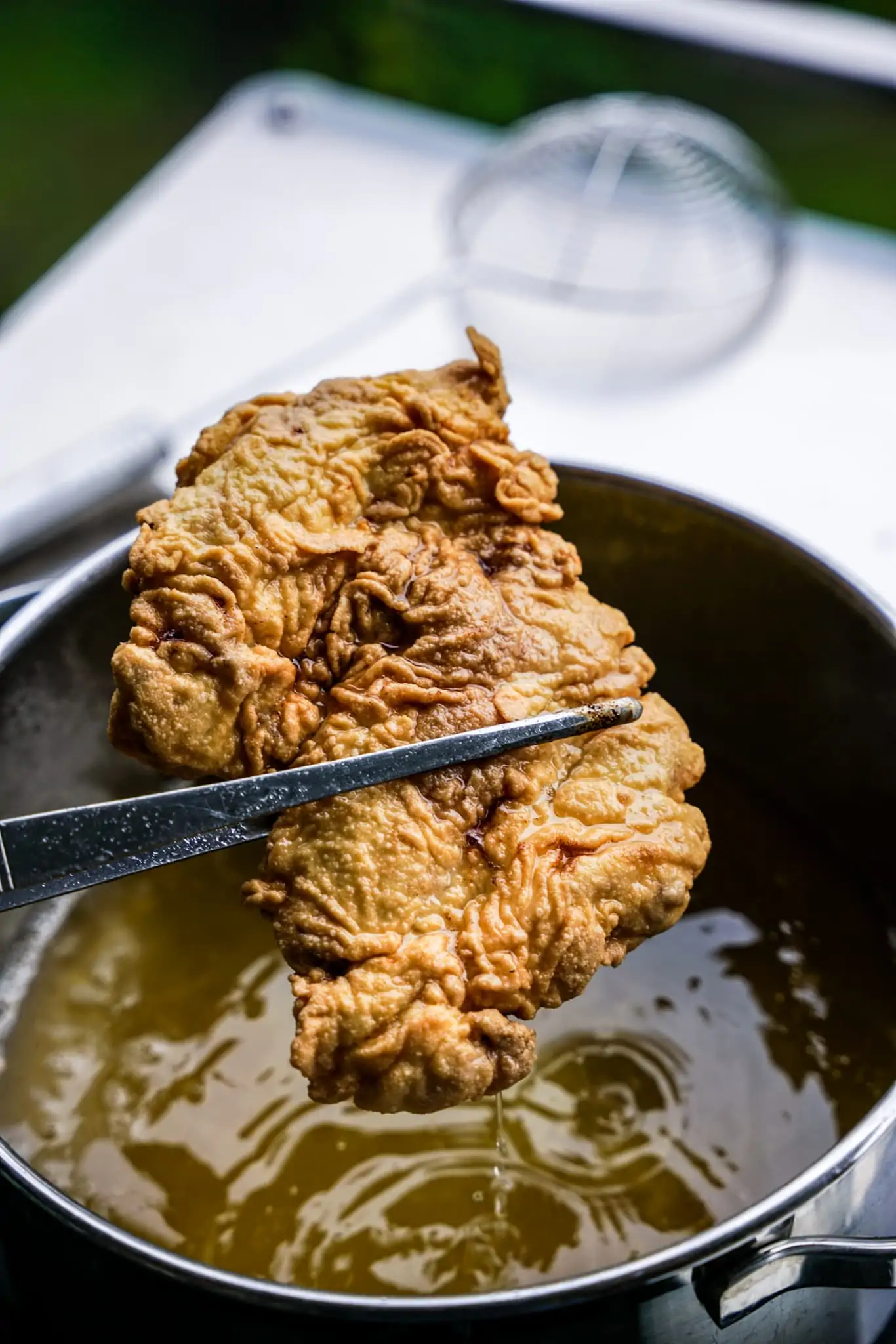 Die bereits frittierten Stücke im 60 °C warm vorgeheizten Backofen warmhalten, bis alles fertig ist.