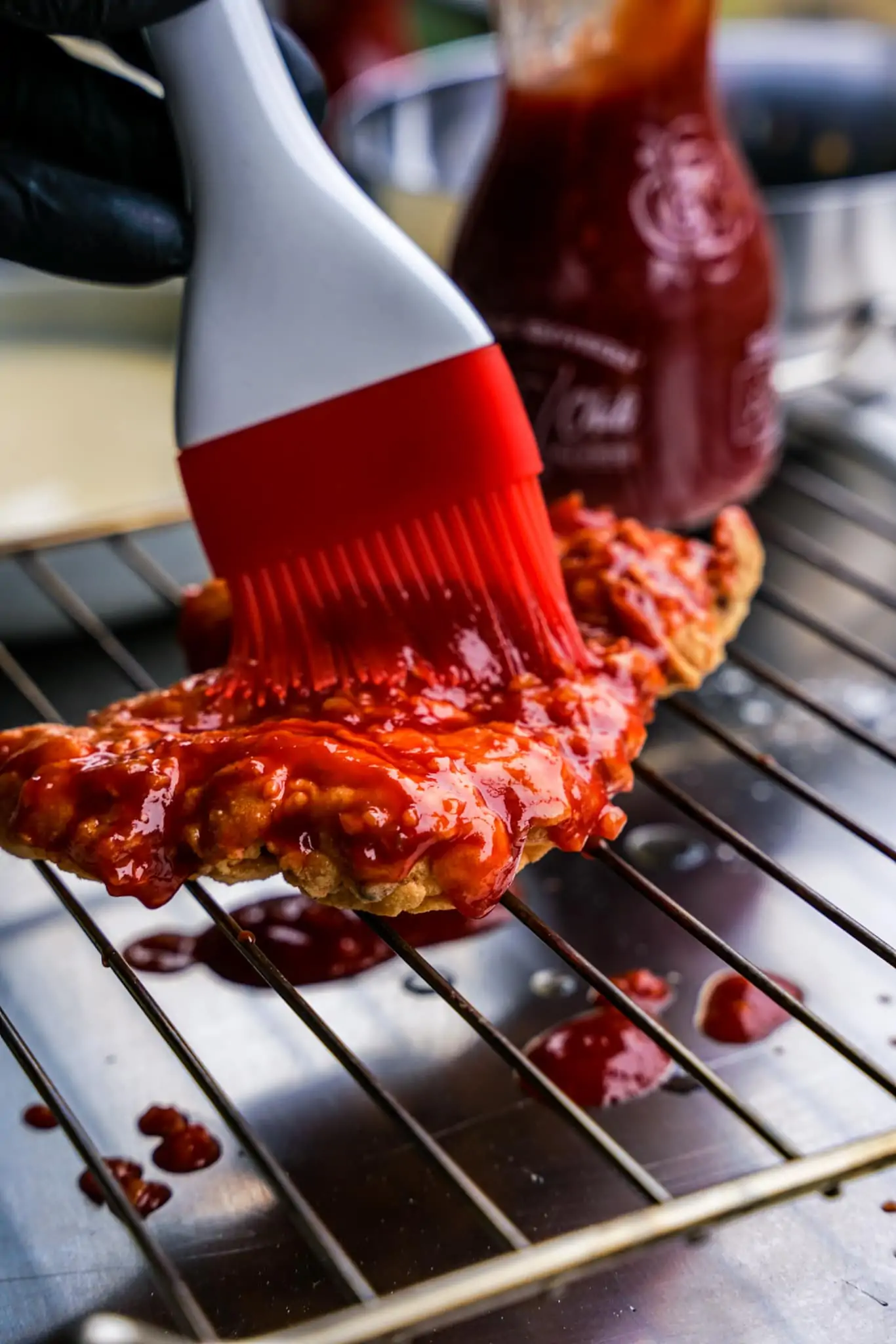 Dann das Hühnchen mit Sweet Chili Sauce bestreichen und draufsetzen.