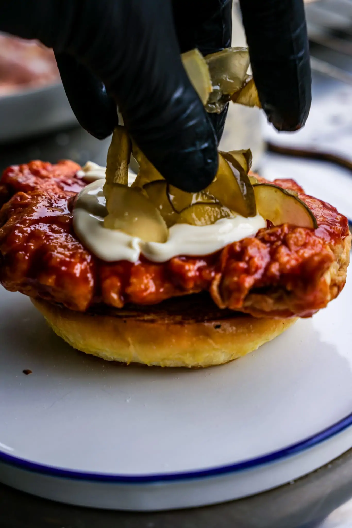 Zuletzt Essiggurkerl und den Burgerdeckel drauf! Fertig ist unser Sweet Chili-Fried Chicken!