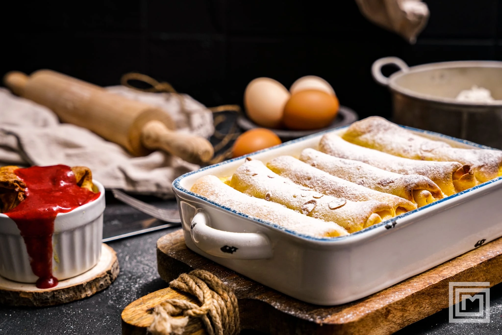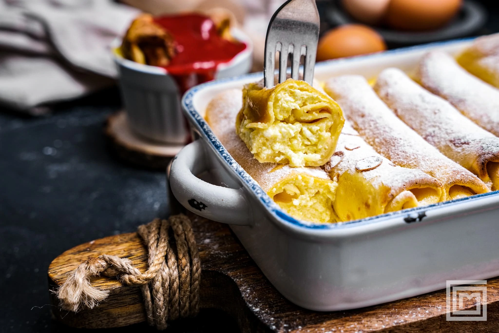 Mit Staubzucker bestreuen und mit Erdbeersauce servieren.