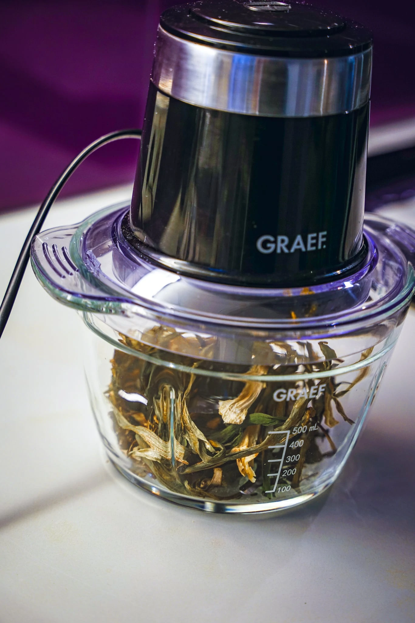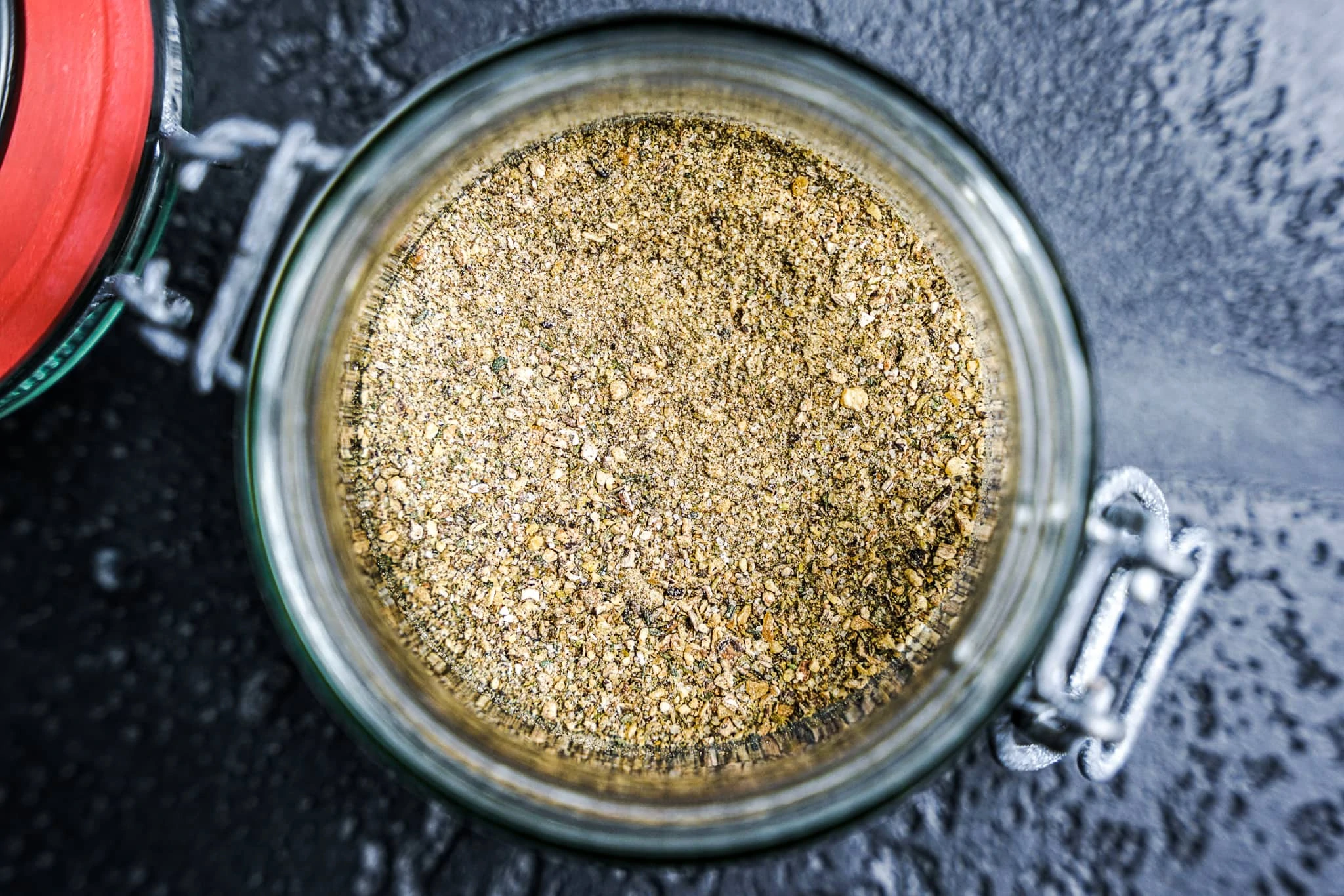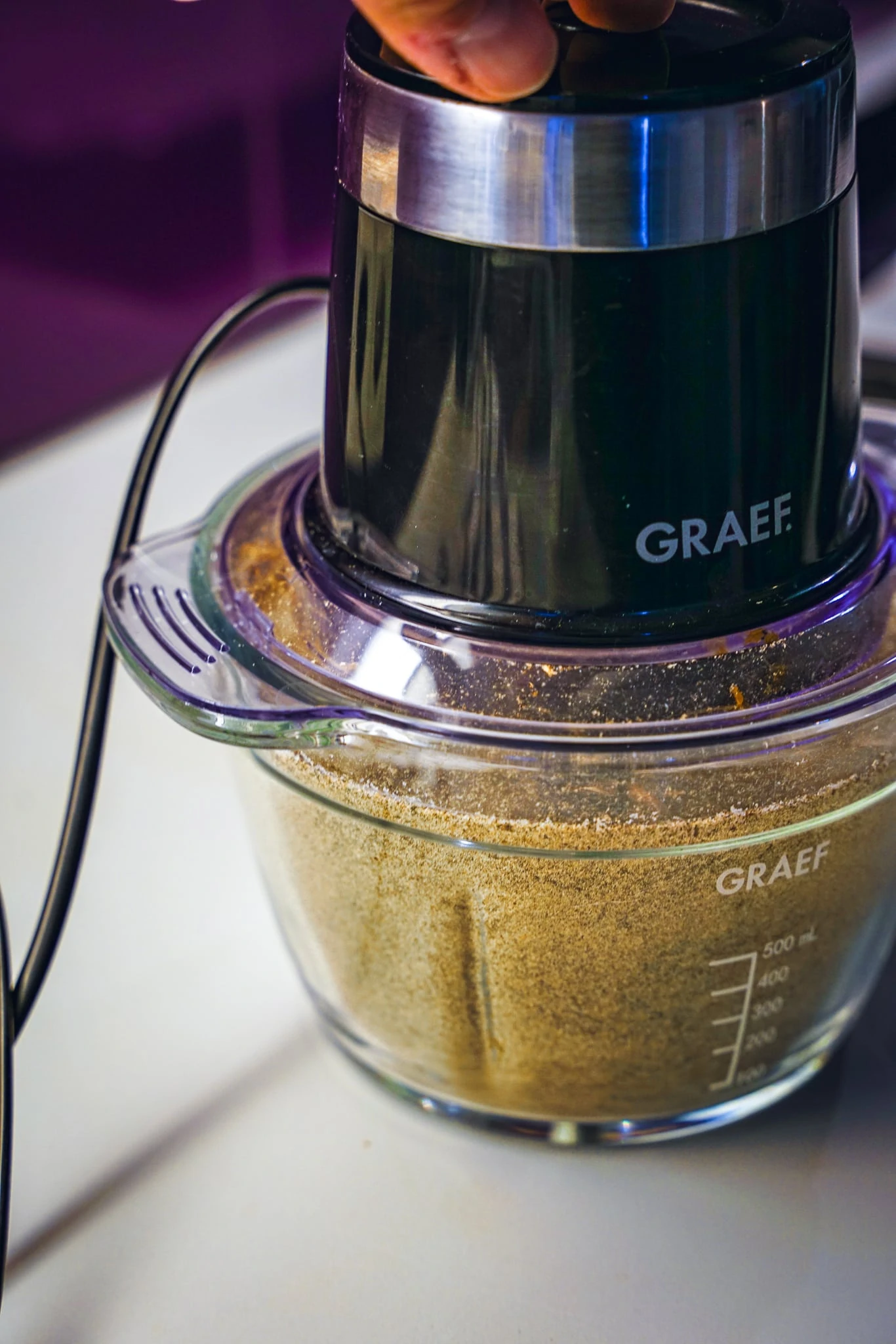 In einer Küchenmaschine oder mithilfe eines Mixers fein mahlen und zuletzt mit dem Salz mischen.