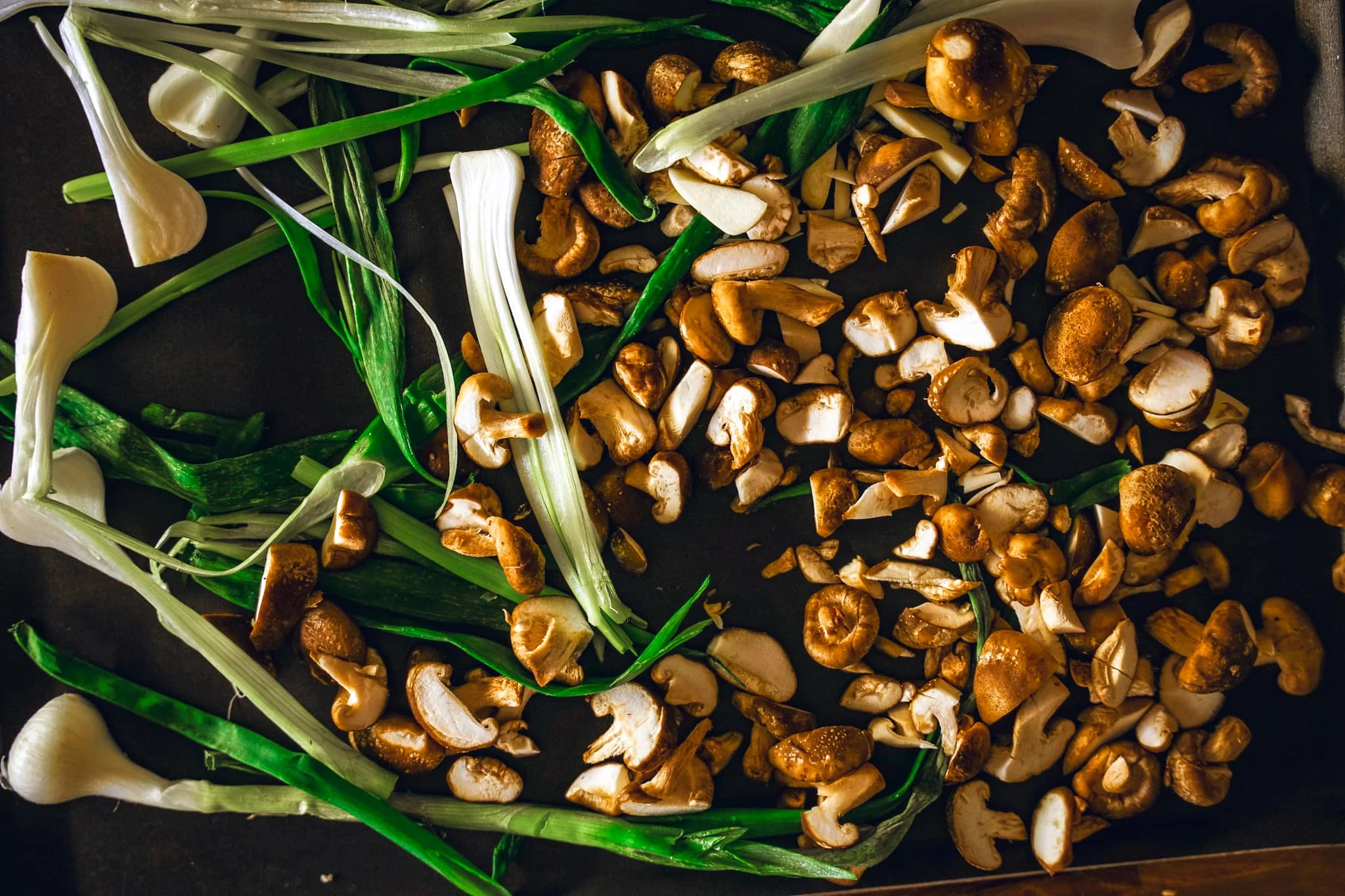 Dann die Pilze in dünne Scheiben schneiden und den Knoblauch fein würfeln.