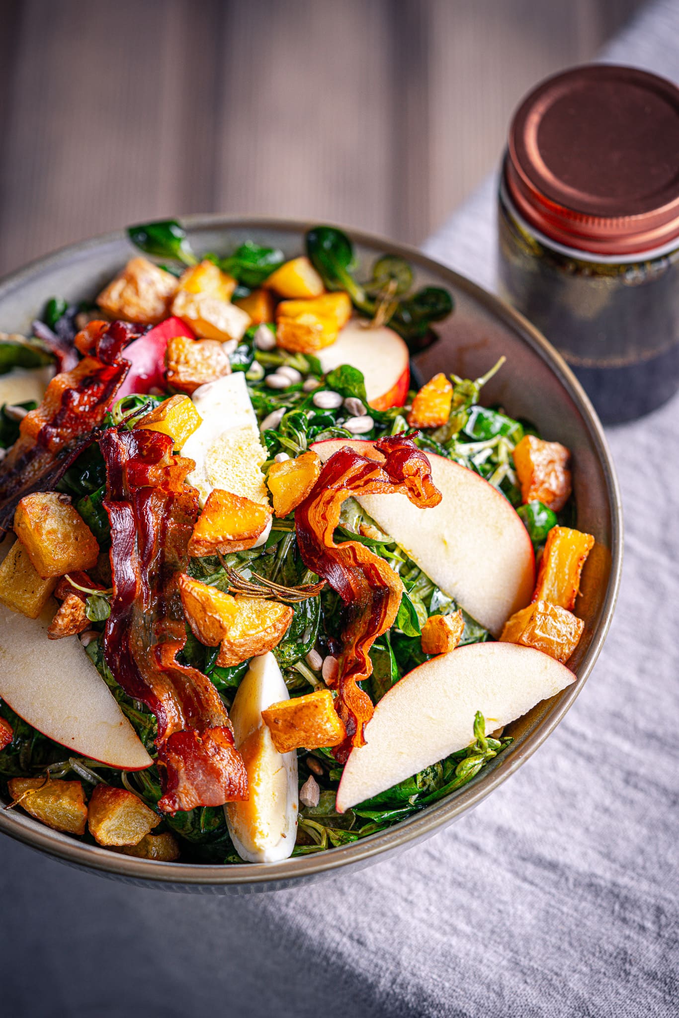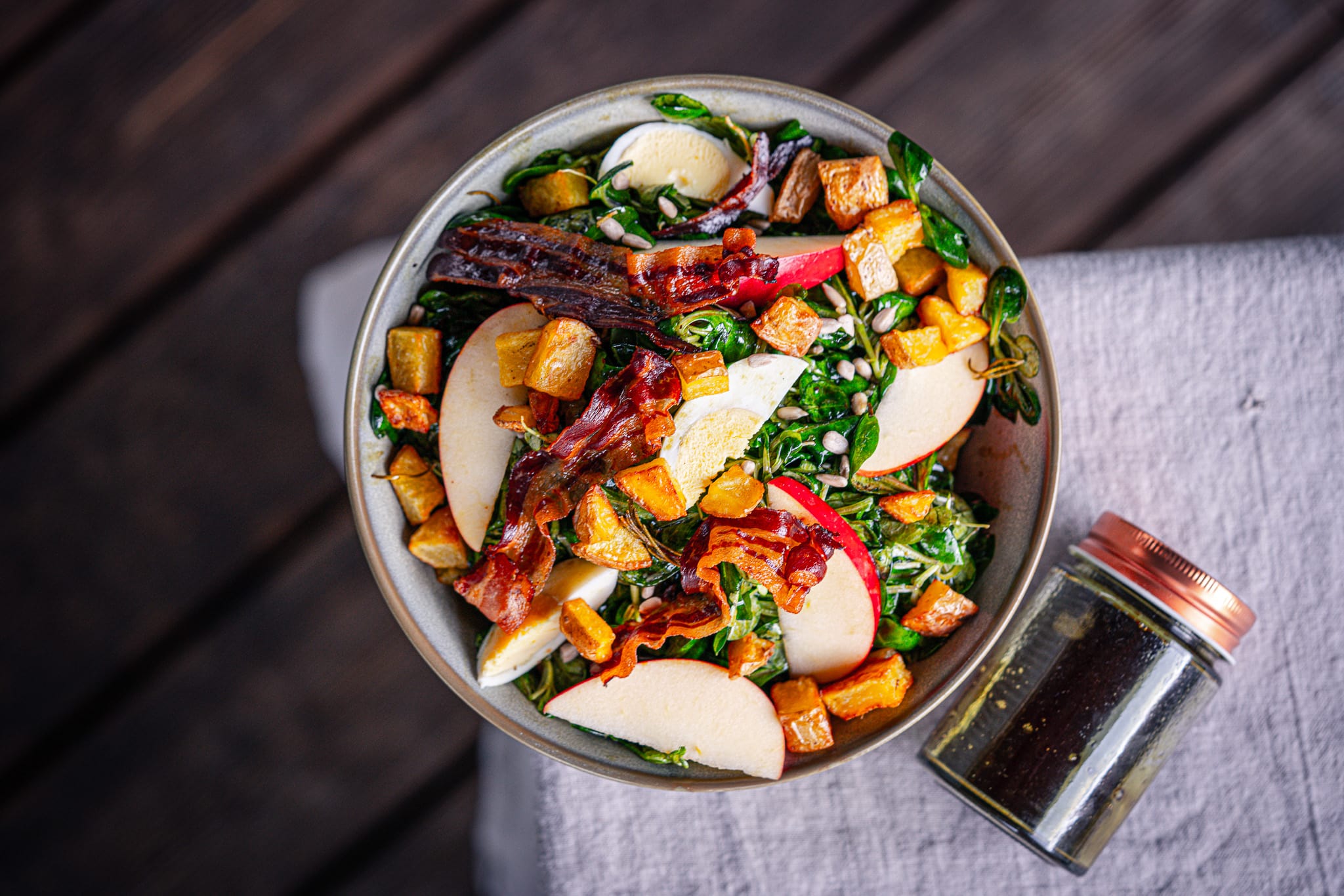 Darüber kommen die knusprigen Erdäpfelstücke, in kleine Stücke geteilter knuspriger Speck, Apfelspalten und die harten Eier.