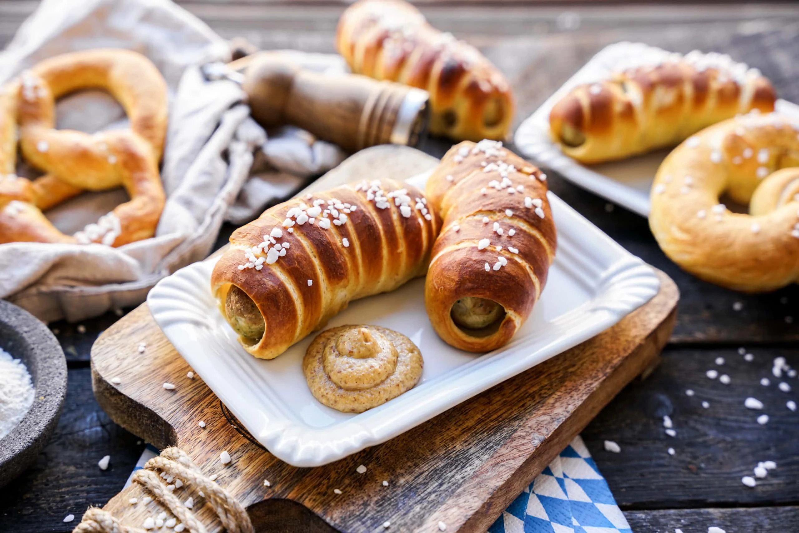 Die Weißwürste mit Hagelsalz bestreuen und für 15-20 Minuten im Ofen backen bzw. bis sie die typische Brezelfarbe haben.
