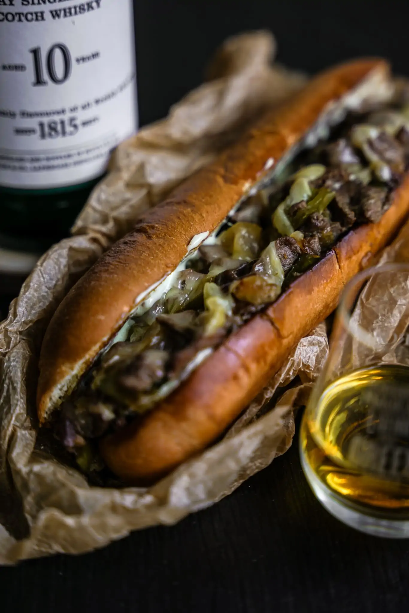 Whisky-infused Philadelphia Cheese Steak – easy, aromatisch und mit einer richtig schön rauchigen Whiskey-Nuance. Verpackt in ein köstliches Hot Dog Brioche Bun. Wer sich das entgehen lässt, ist wahrlich selbst schuld.