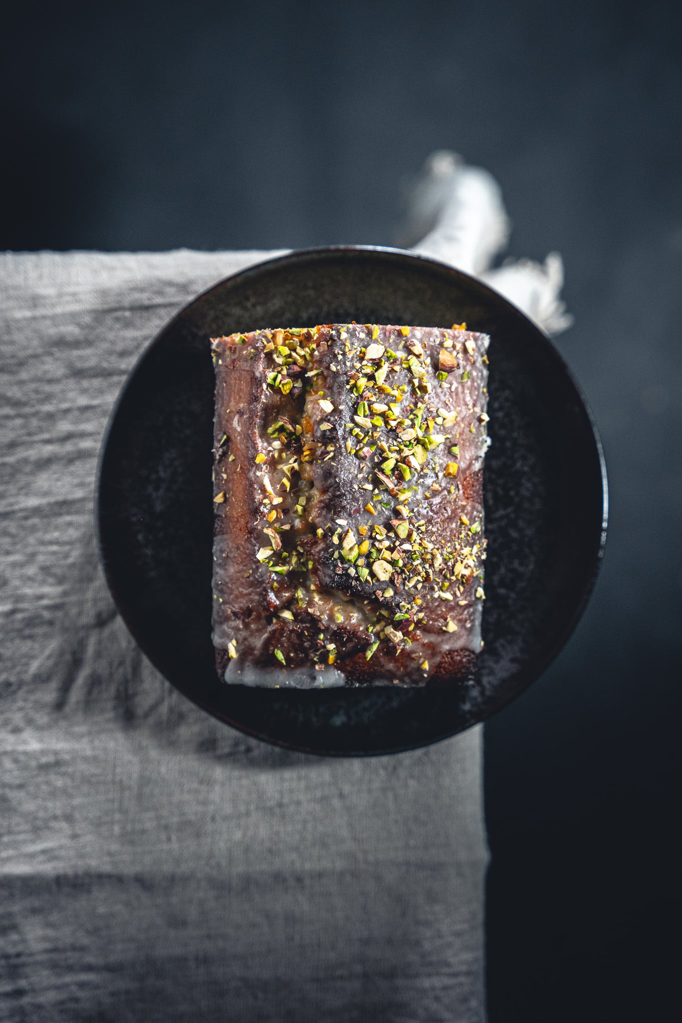 Während der Kuchen auskühlt, Staubzucker und Zitronensaft glatt rühren, über den Kuchen gießen und sofort mit gehackten Pistazien/Mandeln bestreuen.