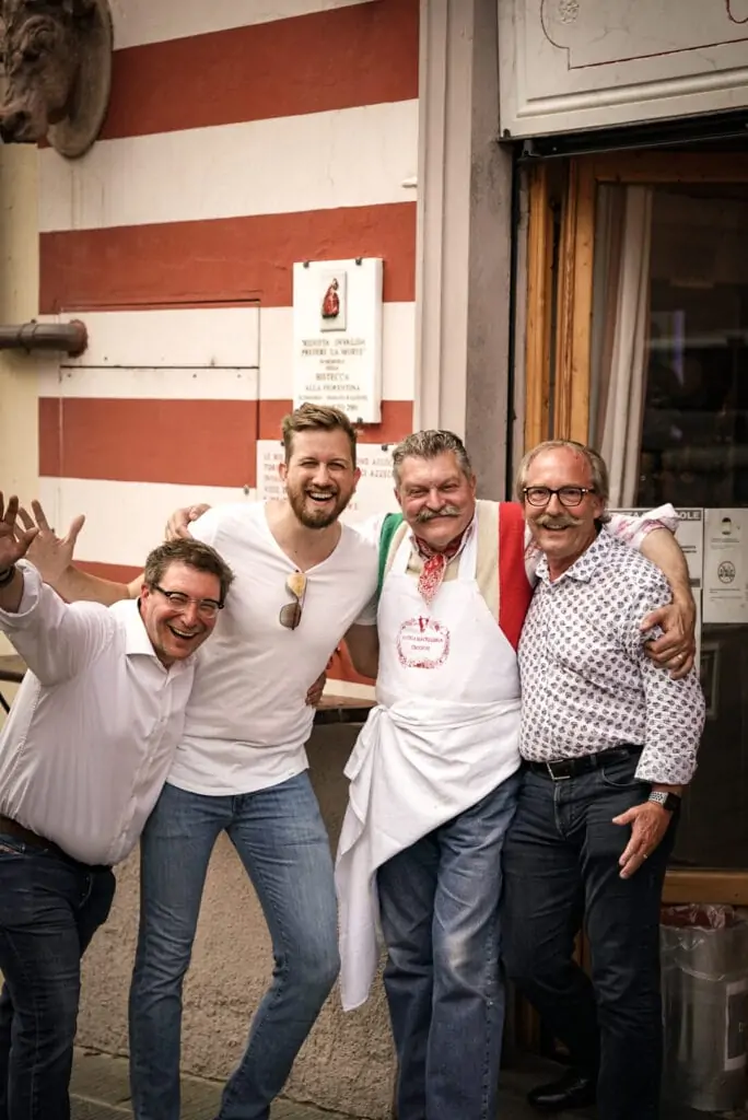 Vor dem rot-weiß gestrichenen Geschäft steht eine Keramik-Kuh und Menschen tummeln sich vor dem Eingang. Schon von weitem haben wir die lautstarke Stimme von Dario Cecchini gehört. Ich bin ein Fan vom italienischen Temperament und der Gastfreundschaft. Dario hat uns sofort herzlich begrüßt und umarmt. Wer jetzt meint „ach, das war bestimmt nur Show“, der liegt falsch. Klar, Dario Cecchini ist eine Rampensau. Aber diese Herzlichkeit und die Freude uns zu sehen, sind echt gewesen. Es hat ihn gefreut, dass wir extra wegen ihm nach Panzano gekommen sind.