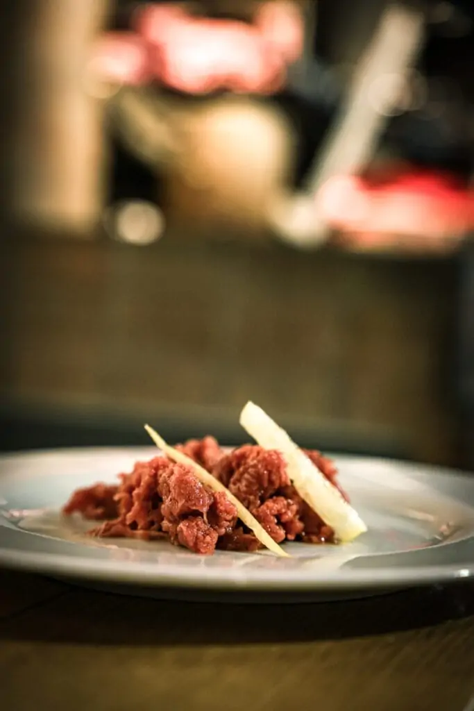 Ursprünglichkeit und der pure Geschmack seiner Zutaten stehen bei Dario wie gesagt im Vordergrund. Das spiegelt sich auch bei seinem Beef Tatar wider. Statt mariniertem Fleisch gibt’s Dario’s Salzmischung, Zitrone und Olivenöl.