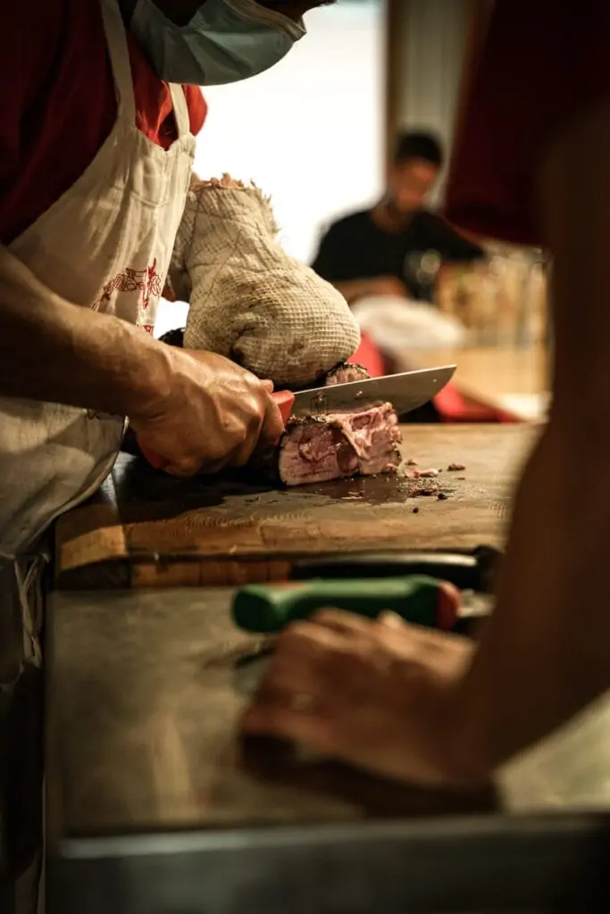 Dario Cecchini ist auf der ganzen Welt bekannt für sein Fleisch. Aber eines gleich vorweg: Wer auf der Suche nach einem medium gebratenen Steak mit fancy Beilagen ist, ist bei ihm falsch. Mit seinem Fleisch möchte Dario ein Lebensgefühl vermitteln. Die Wertschätzung des Tieres steht bei ihm ganz klar im Vordergrund. Er verwertet das ganze Tier – von der Nase bis zum Schwanz. Genau das finde ich so gut an Dario, weil das genau meine Einstellung widerspiegelt. Man muss nicht immer nur das Filetsteak am Teller haben. Es gibt so viele Cuts, jeder schmeckt anders, jeder schmeckt gut. Für unser Fleisch stirbt ein Tier, das muss man ganz unverblümt sagen. Deswegen sollte man meiner Meinung nach auch alles davon verwerten und nichts wegschmeißen.