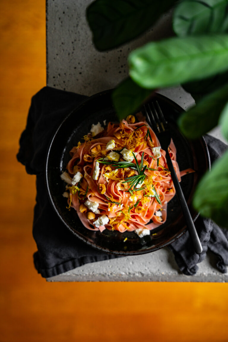 Das Thema Italien zieht sich bei uns auch noch durch die Hauptspeise. Pasta ist eben nicht nur ein absoluter Klassiker, sondern einfach auch superromantisch. Das weiß seit Susi & Strolch schließlich jedes Kind. Geht aber auch ohne Fleischbällchen. Heuer habe ich mich für eine wirklich ganz besondere Variante entschieden: Rote Rüben Fettuccine mit Feta und gerösteten Nüssen. Da ich ja bekanntermaßen nicht der motivierteste Pâtissier bin und mit Kitsch eher weniger anfangen kann, kommt das klassische Valentins-Rot einfach im Hauptgericht vor. Und zwar in Form dieser hausgemachten Pasta. Die roten Rüben verleihen der Fettuccine ein kräftiges Rot, das durch das Kochen zwar etwas abgeschwächt wird, aber dennoch wunderschön aussieht. In diesem expliziten Gericht mitunter auch in Form der aromatischen Kräuter. Dieses Pastagericht ist wirklich eine wahre Geschmacksexplosion und regt den Appetit auf mehr an.